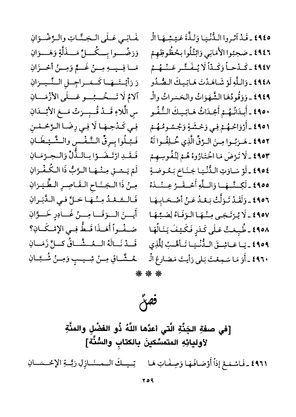 فصلٌ [في صفةِ الجَنَّةِ الَّتي أعدَّها اللَّهُ ذُو الفضْلِ والمنَّةِ لأوليائِهِ المتمسِّكينَ بالكتابِ والسُّنَّة]