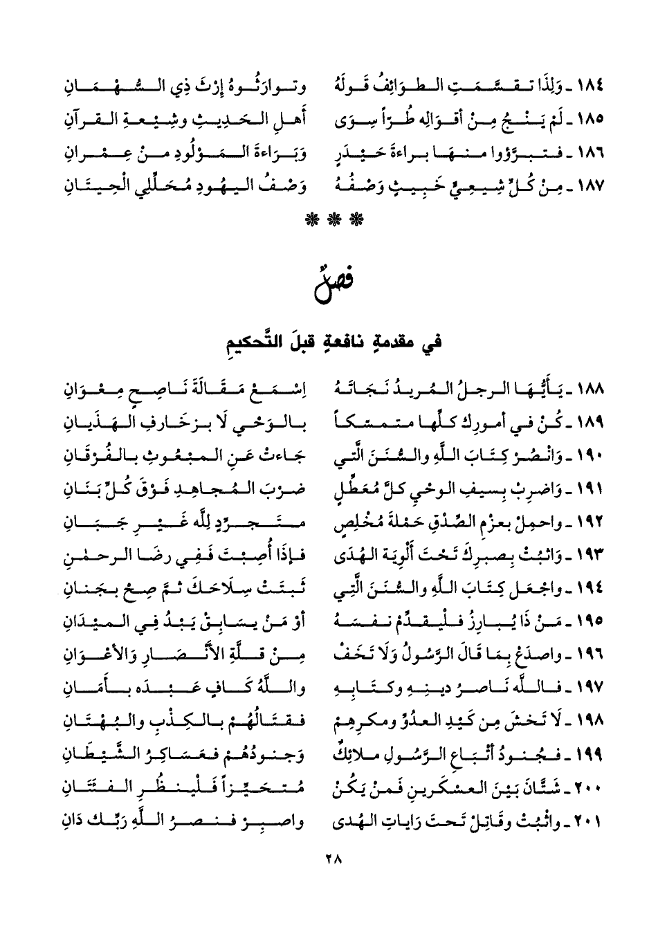 ١٨٩ - كُنْ في أمورِك كلِّها متمسّكًا ... بالوَحْي لَا بزخَارفِ الهَذَيانِ