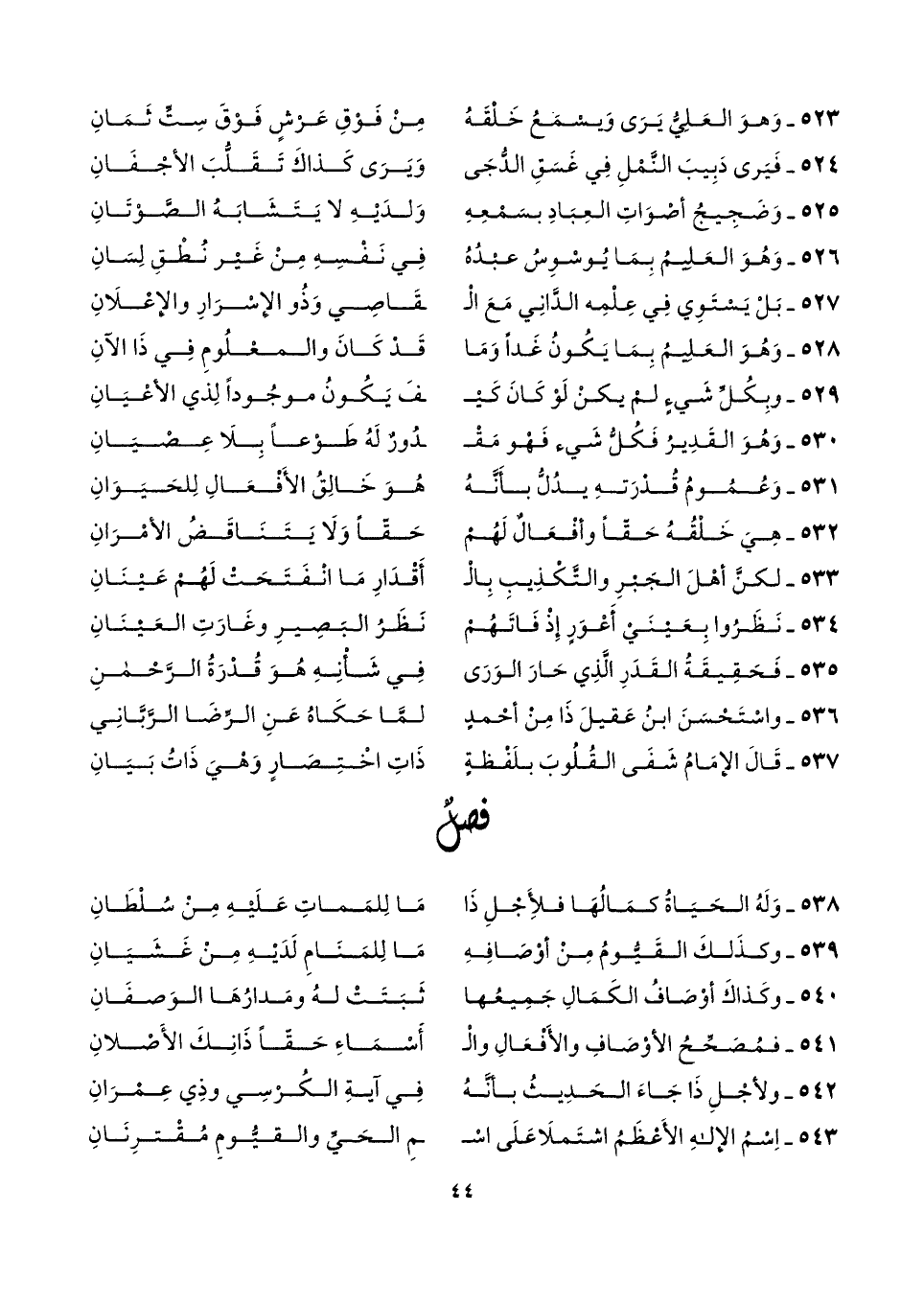 ٥٣٩ - وكذَلكَ القَيُّومُ مِنْ أوْصَافِهِ ... مَا لِلمَنَامِ لَدَيْهِ مِنْ غَشَيَانِ