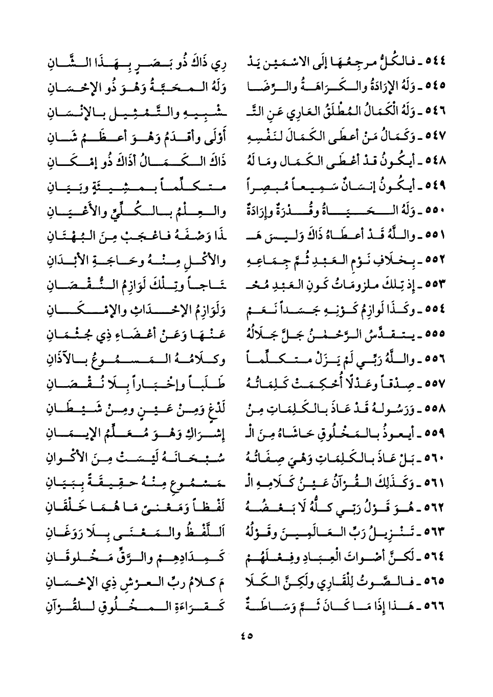 ٥٦٢ - هُوَ قَوْلُ رَبّي كلُّهُ لَا بَعْضُهُ ... لَفْظًا وَمَعْنىً مَا هُمَا خَلْقَانِ