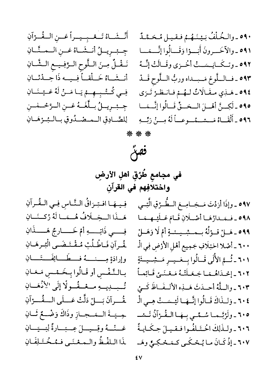 ٥٩٧ - وإذَا أرَدْتَ مَجَامِعَ الطُّرُقِ الَّتِي ... فِيهَا افتِرَاقُ النَّاسِ فِي القُرآنِ