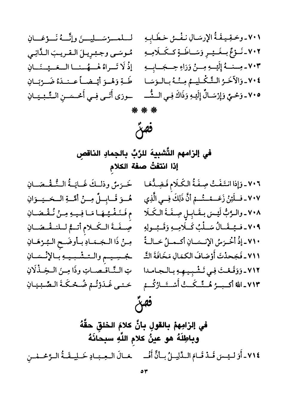 ٧٠٨ - والرَّبُّ لَيسَ بقَابِلٍ صِفَةَ الكَلَا ... مِ فَنَفْيُهَا مَا فِيهِ مِنْ نُقْصَانِ