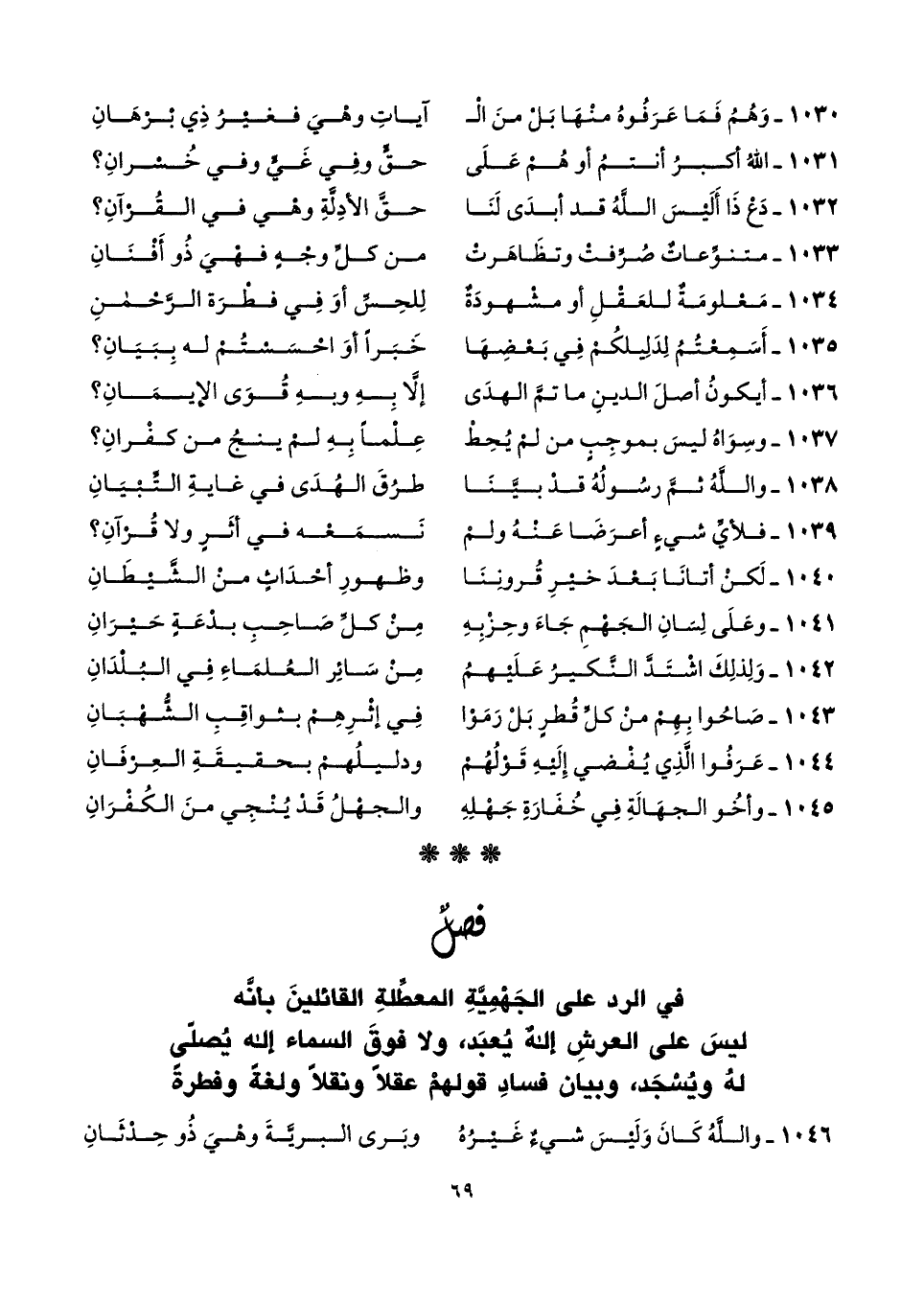 فصلٌ في الرد على الجَهْمِيَّةِ المعطِّلةِ القائلينَ بأنَّه ليسَ علي العرشِ إلهٌ يُعبَد، ولا فوقَ السماء إله يُصلّى لهُ ويُسْجَد، وبيان فسادِ قولهمْ عقلًا ونقلًا ولغةً وفطرةً