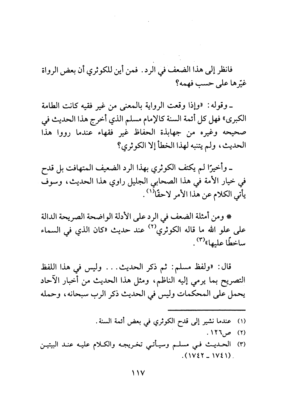 * ومن أمثلة الضعف في الرد على الأدلة الواضحة الصريحة الدالة على علو الله ما قاله الكوثري (¬٢) عند حديث "كان الذي في السماء ساخطًا عليها" (¬٣).