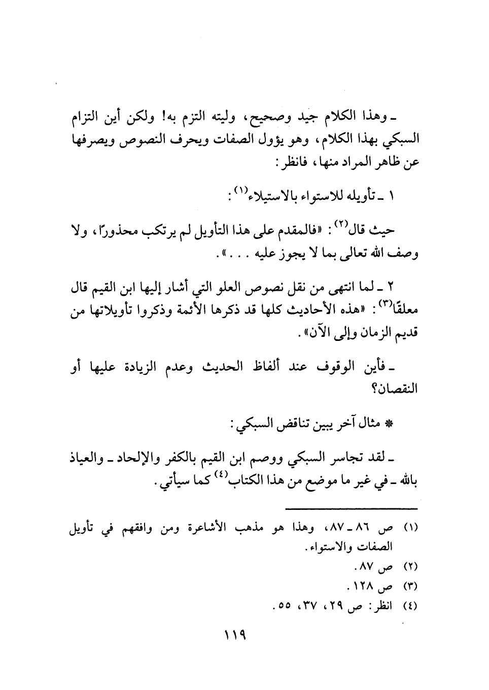 - وهذا الكلام جيد وصحيح، وليته التزم به! ولكن أين التزام السبكي بهذا الكلام، وهو يؤول الصفات ويحرف النصوص ويصرفها عن ظاهر المراد منها، فانظر: