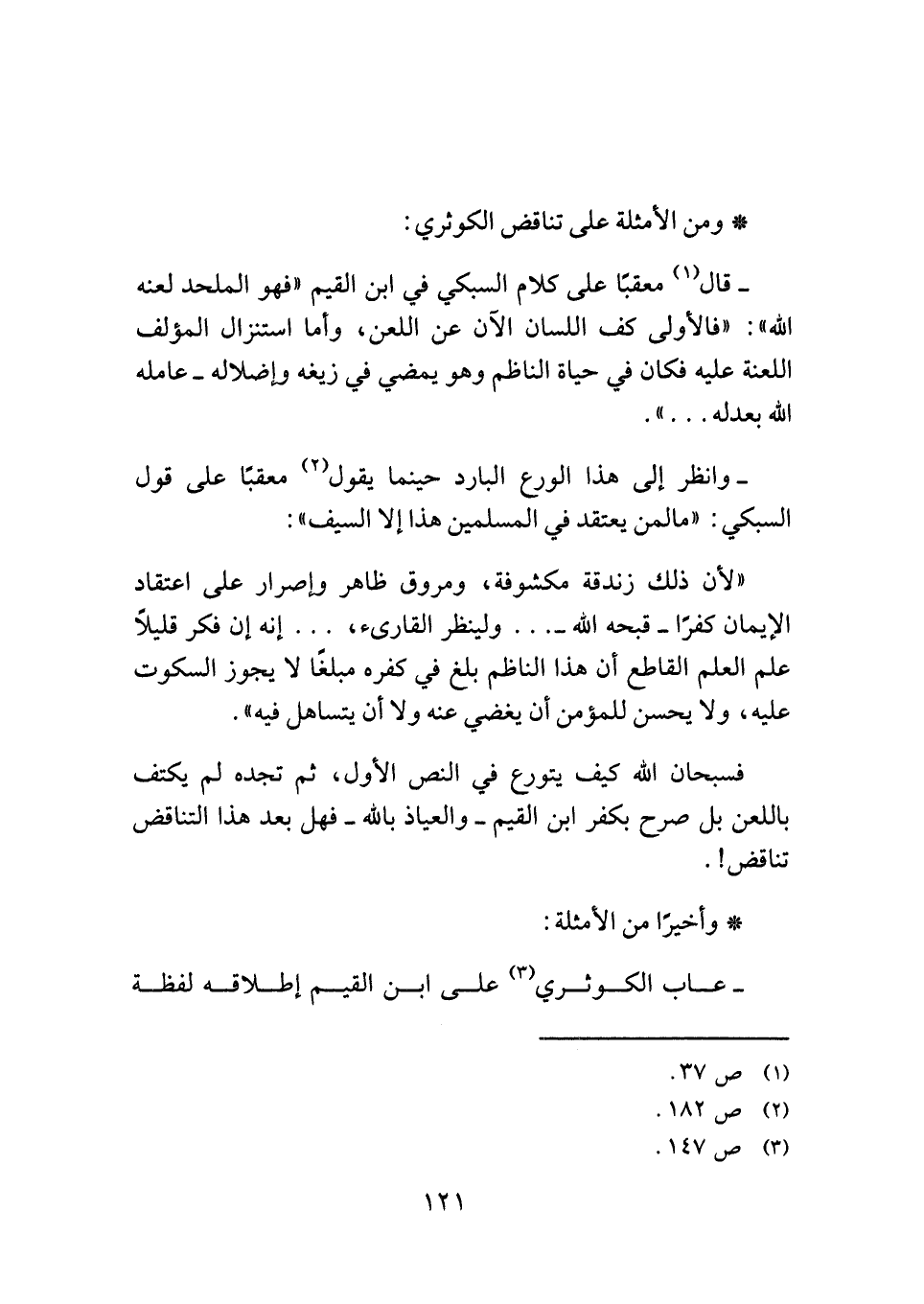 فسبحان الله كيف يتورع في النص الأول، ثم تجده لم يكتف باللعن بل صرح بكفر ابن القيم -والعياذ بالله- فهل بعد هذا التناقض تناقض!.