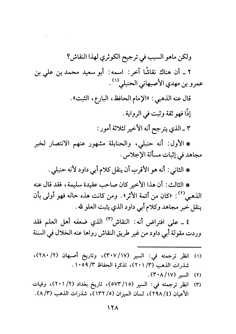 * الثالث: أن هذا الأخير كان صاحب عقيدة سليمة، فقد قال عنه الذهبي (¬٢): "كان من أئمة الأثر". ومن كانت هذه حاله فهو أولى بأن ينقل خبر مجاهد وكلام أبي داود الذي يثبت العلو لله.
