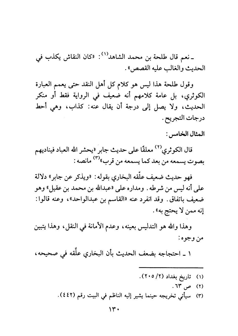 وقول طلحة هذا ليس هو كلام كل أهل النقد حتى يعمم العبارة الكوثري، بل عامة كلامهم أنه ضعيف في الرواية فقط أو منكر الحديث، ولا يصل إلى درجة أن يقال عنه: كذاب، وهي أحط درجات التجريح.