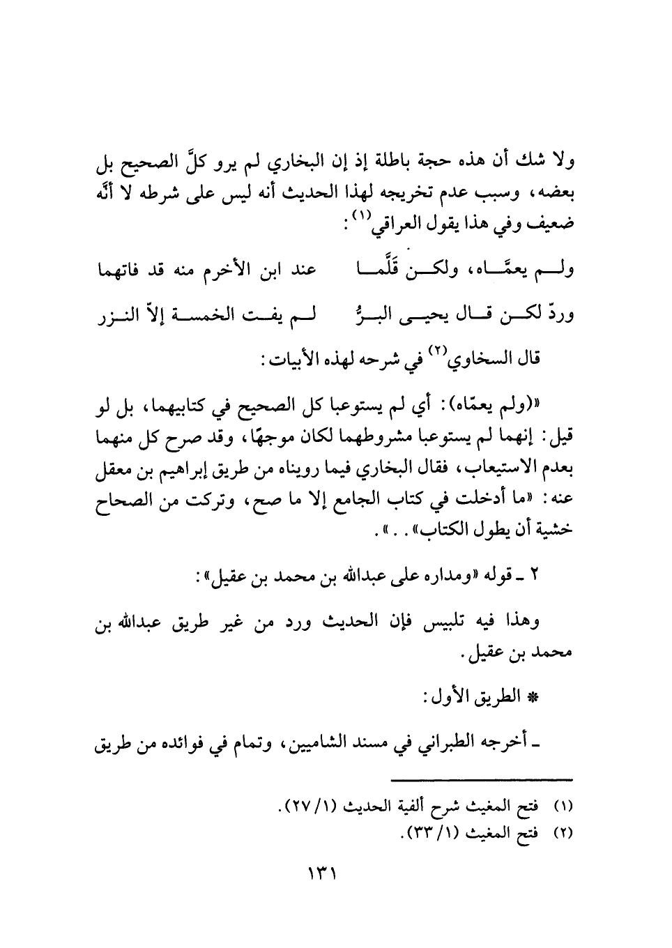 ولا شك أن هذه حجة باطلة إذ إن البخاري لم يرو كلَّ الصحيح بل بعضه، وسبب عدم تخريجه لهذا الحديث أنه ليس على شرطه لا أنَّه ضعيف وفي هذا يقول العراقي (¬١):