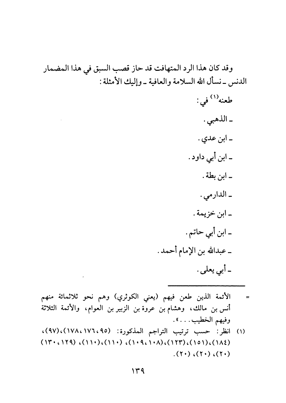 = الأئمة الذين طعن فيهم (يعني الكوثري) وهم نحو ثلاثمائة منهم أنس بن مالك، وهشام بن عروة بن الزبير بن العوام، والأئمة الثلاثة وفيهم الخطيب ... ".