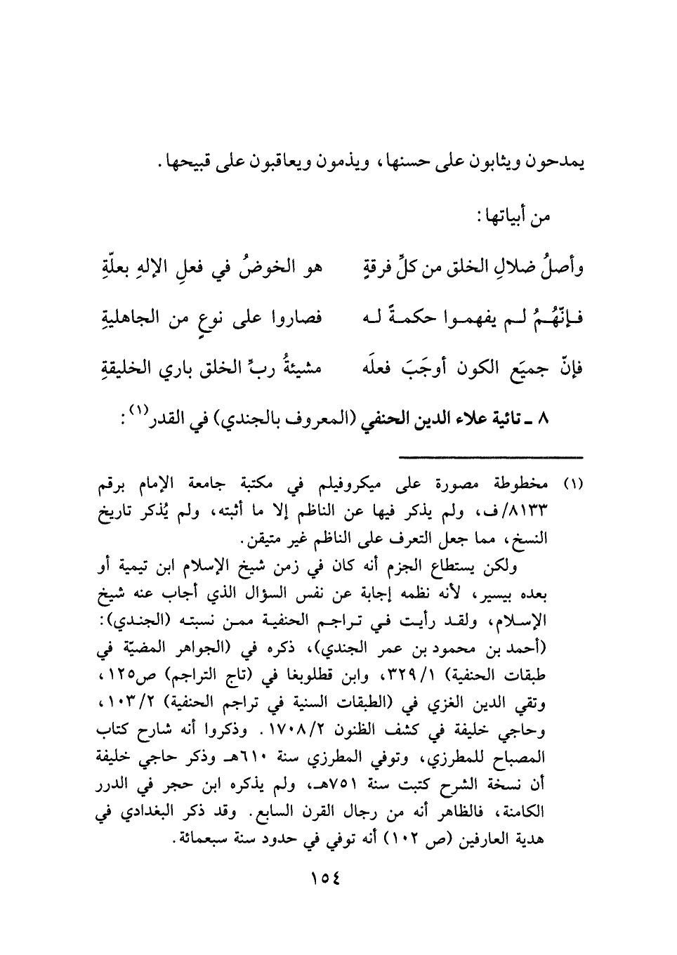 ٨ - تائية علاء الدين الحنفي (المعروف بالجندي) في القدر (¬١):