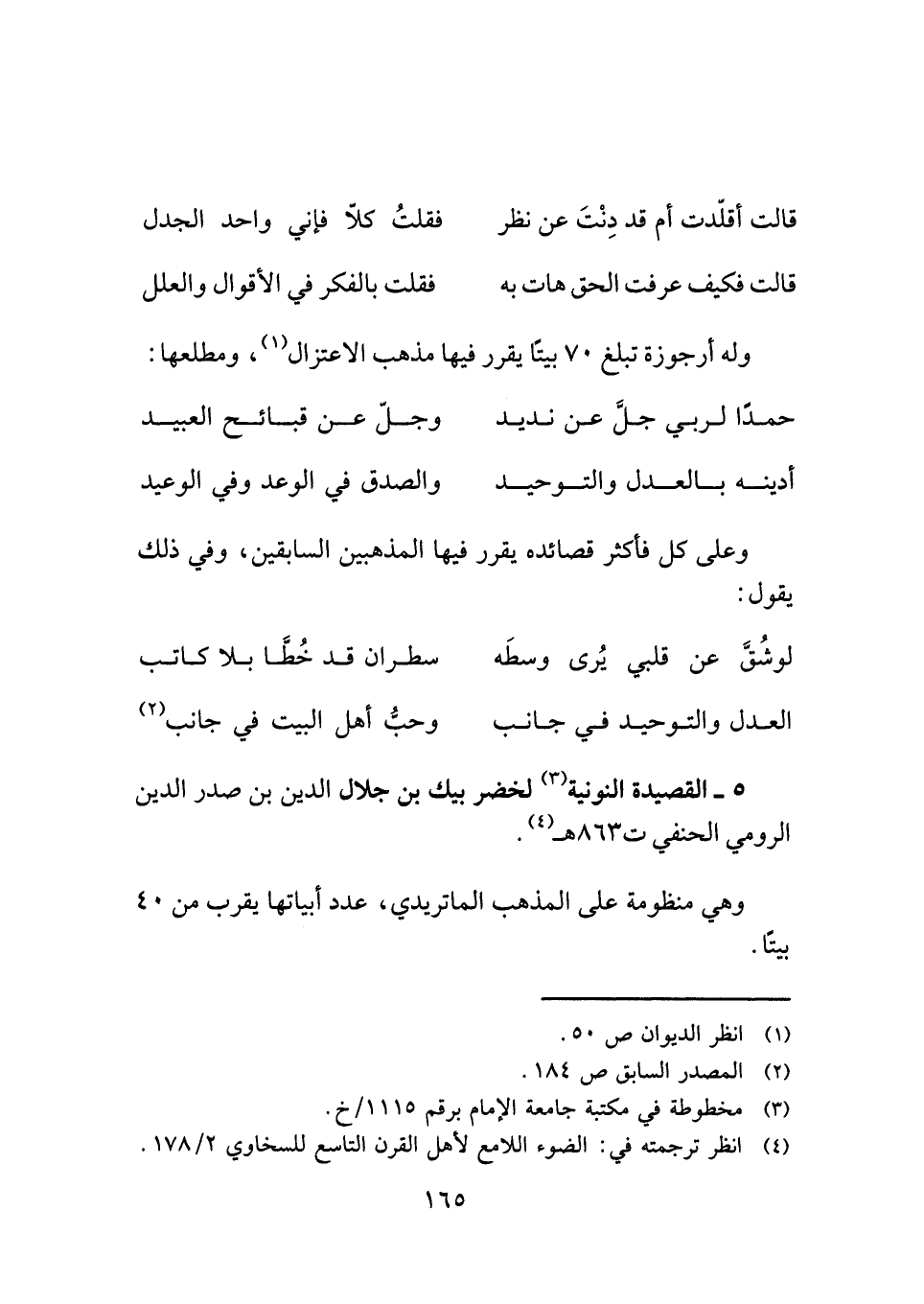 ٥ - القصيدة النونية (¬٣) لخضر بيك بن جلال الدين بن صدر الدين الرومي الحنفي ت ٨٦٣ هـ (¬٤).