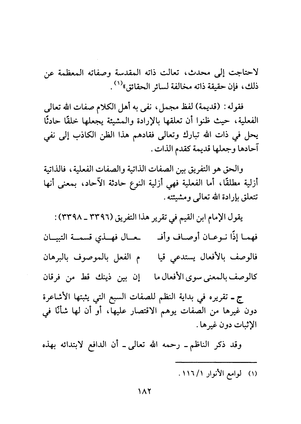 فقوله: (قديمة) لفظ مجمل، نفى به أهل الكلام صفات الله تعالى الفعلية، حيث ظنوا أن تعلقها بالإرادة والمشيئة يجعلها خلفا حادثًا يحل في ذات الله تبارك وتعالى فقادهم هذا الظن الكاذب إلى نفي آحادها وجعلها قديمة كقدم الذات.