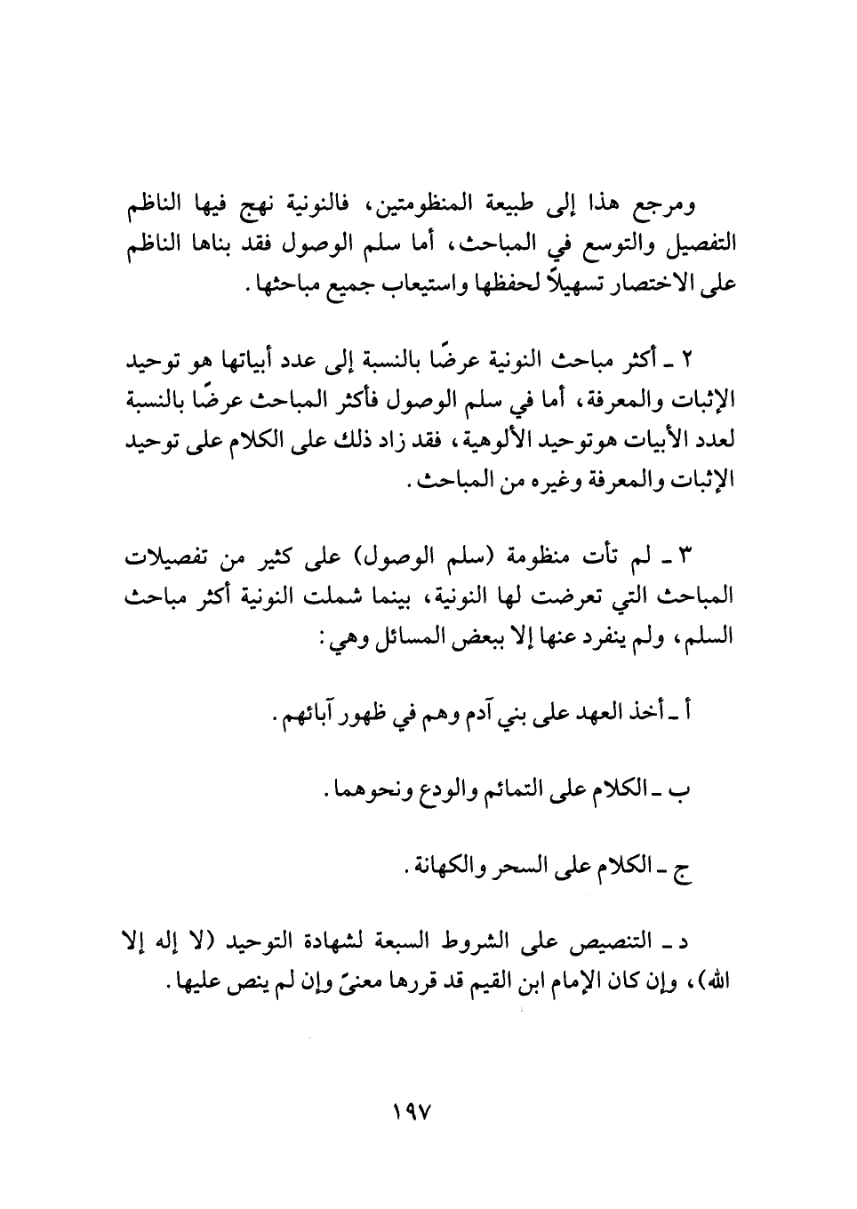 ٣ - لم تأت منظومة (سلم الوصول) على كثير من تفصيلات المباحث التي تعرضت لها النونية، بينما شملت النونية أكثر مباحث السلم، ولم ينفرد عنها إلا ببعض المسائل وهي: