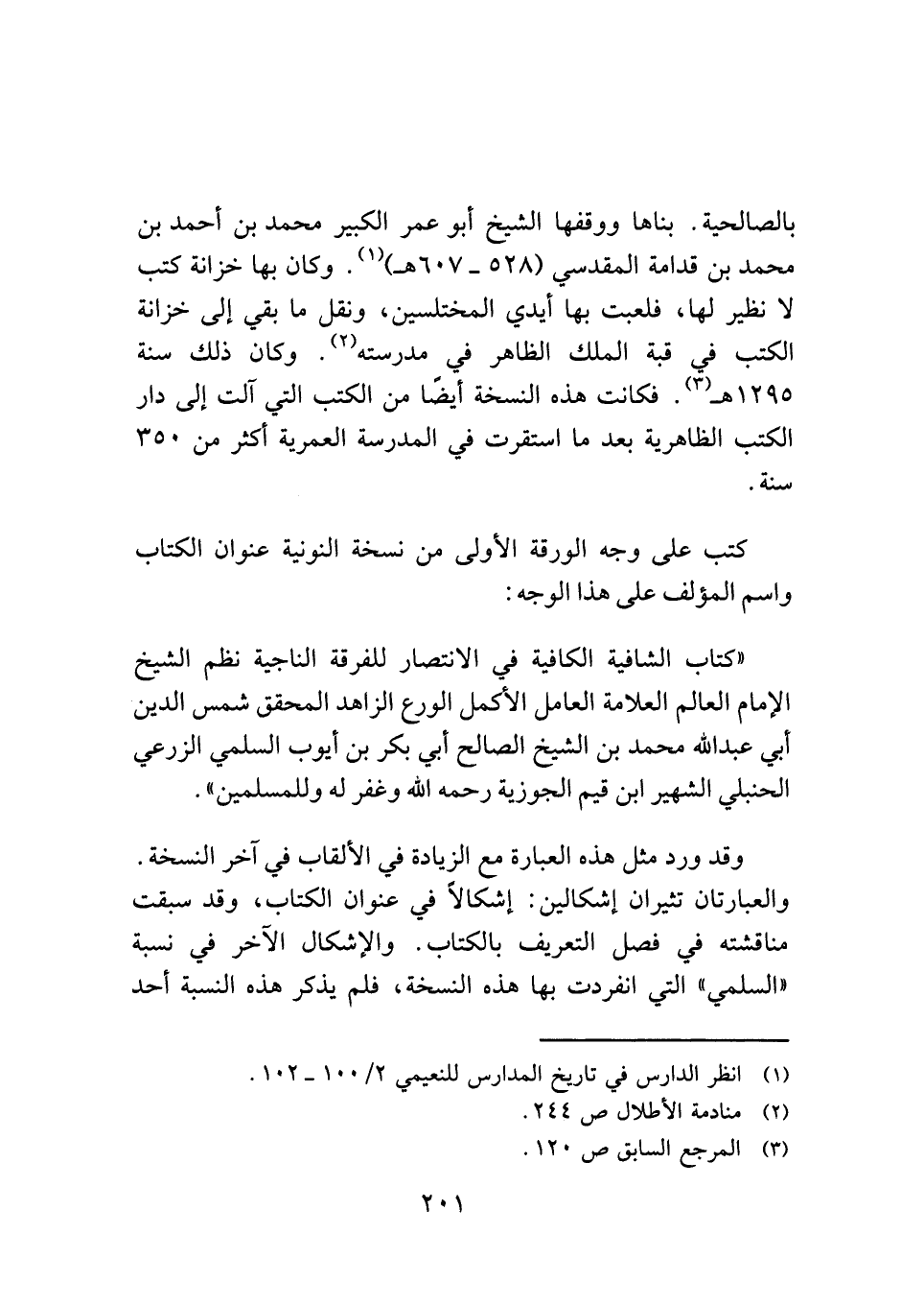 "كتاب الشافية الكافية في الانتصار للفرقة الناجية نظم الشيخ الإمام العالم العلامة العامل الأكمل الورع الزاهد المحقق شمس الدين أبي عبد الله محمد بن الشيخ الصالح أبي بكر بن أيوب السلمي الزرعي الحنبلي الشهير ابن قيم الجوزية رحمه الله وغفر له وللمسلمين".