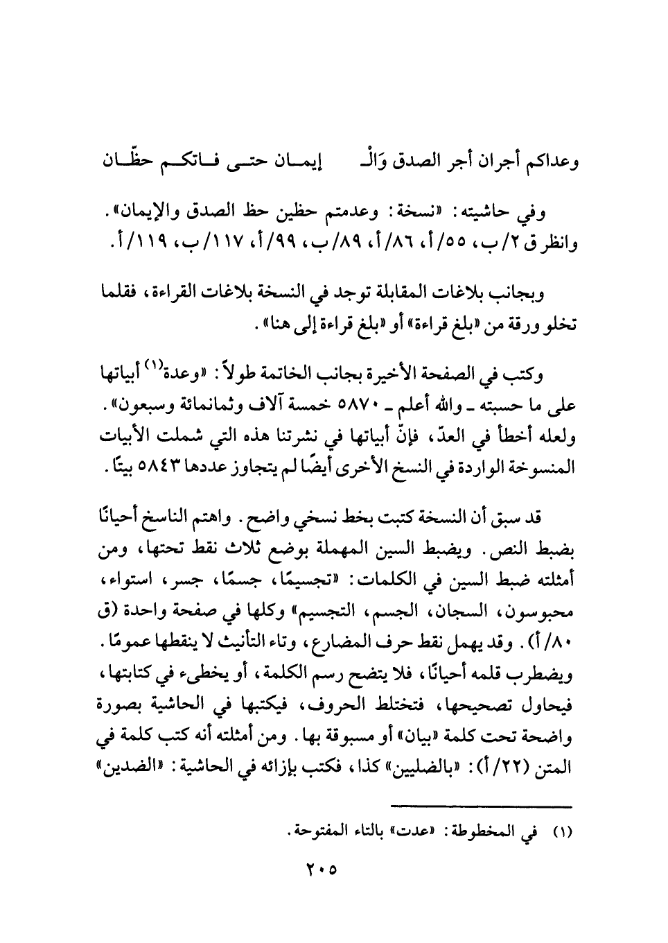 وكتب في الصفحة الأخيرة بجانب الخاتمة طولًا: "وعدة (¬١) أبياتها على ما حسبته - والله أعلم - ٥٨٧٠ خمسة آلاف وثمانمائة وسبعون". ولعله أخطأ في العدّ، فإنّ أبياتها في نشرتنا هذه التي شملت الأبيات المنسوخة الواردة في النسخ الأخرى أيضًا لم يتجاوز عددها ٥٨٤٣ بيتًا.