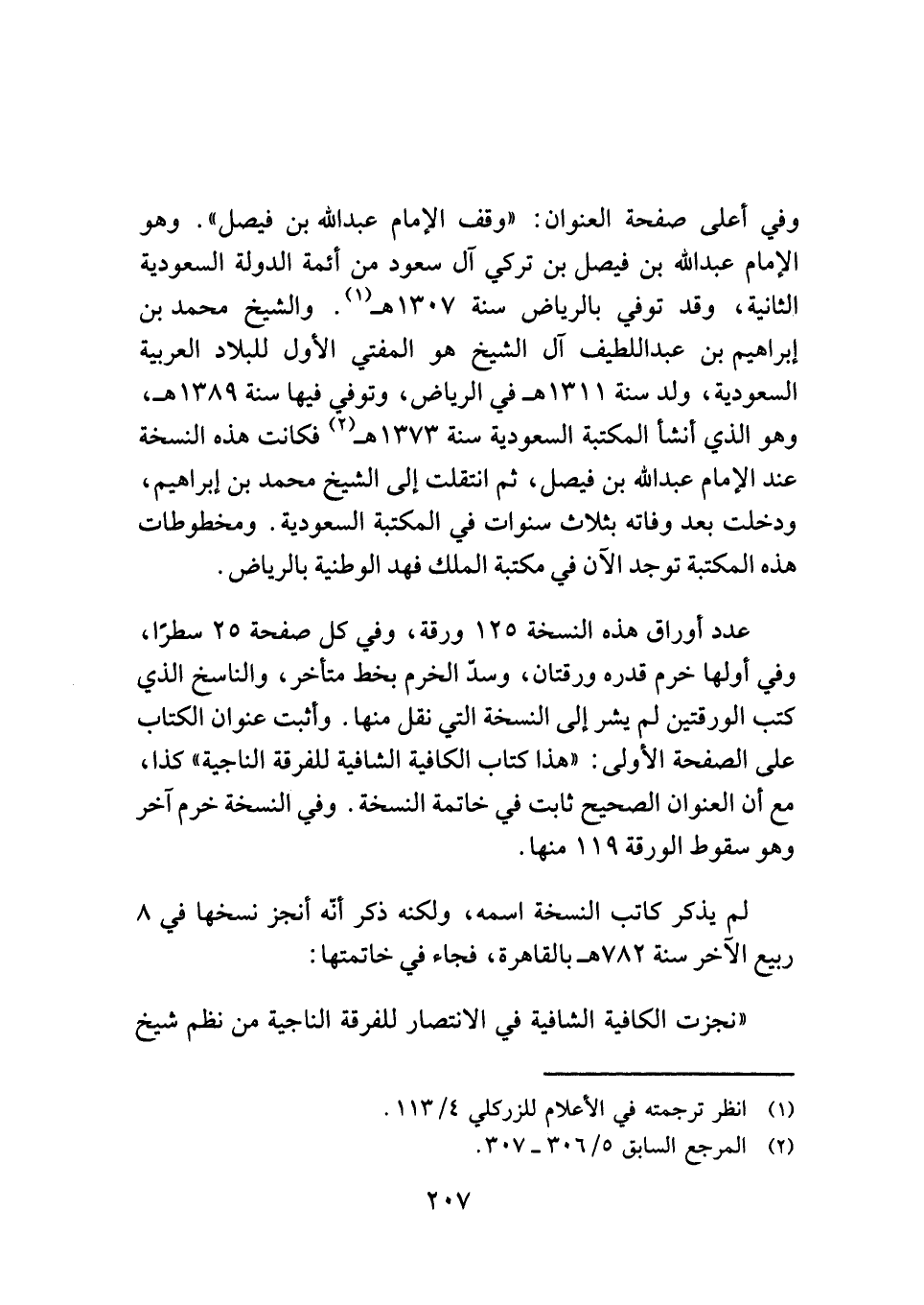 وفي أعلى صفحة العنوان: "وقف الإمام عبد الله بن فيصل". وهو الإمام عبد الله بن فيصل بن تركي آل سعود من أئمة الدولة السعودية الثانية، وقد توفي بالرياض سنة ١٣٠٧ هـ (¬١). والشيخ محمد بن إبراهيم بن عبد اللطيف آل الشيخ هو المفتي الأول للبلاد العربية السعودية، ولد سنة ١٣١١ هـ في الرياض، وتوفي فيها سنة ١٣٨٩ هـ، وهو الذي أنشأ المكتبة السعودية سنة ١٣٧٣ هـ (¬٢) فكانت هذه النسخة عند الإمام عبد الله بن فيصل، ثمَّ انتقلت إلى الشيخ محمد بن إبراهيم، ودخلت بعد وفاته بثلاث سنوات في المكتبة السعودية. ومخطوطات هذه المكتبة توجد الآن في مكتبة الملك فهد الوطنية بالرياض.