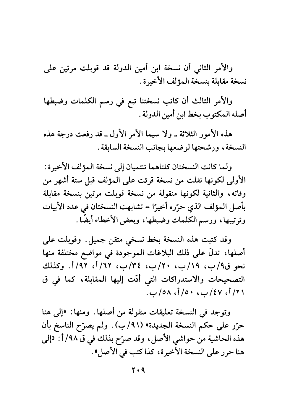 والأمر الثاني أن نسخة ابن أمين الدولة قد قوبلت مرتين على نسخة مقابلة بنسخة المؤلف الأخيرة.