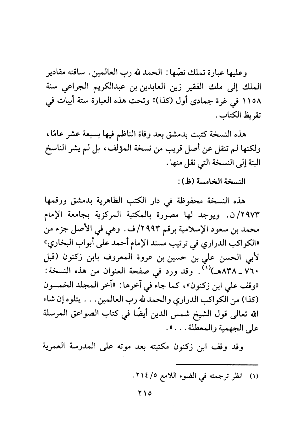 هذه النسخة محفوظة في دار الكتب الظاهرية بدمشق ورقمها ٢٩٧٣/ ن. ويوجد لها مصورة بالمكتبة المركزية بجامعة الإمام محمد بن سعود الإسلامية برقم ٢٩٩٣/ ف. وهي في الأصل جزء من "الكواكب الدراري في ترتيب مسند الإمام أحمد على أبواب البخاري" لأبي الحسن علي بن حسين بن عروة المعروف بابن زكنون (قبل ٧٦٠ - ٨٣٨ هـ) (¬١). وقد ورد في صفحة العنوان من هذه النسخة: "وقف علي ابن زكنون"، كما جاء في آخرها: "آخر المجلد الخمسون (كذا) من الكواكب الدراري والحمد لله رب العالمين. . . يتلوه إن شاء الله تعالى قول الشيخ شمس الدين أيضًا في كتاب الصواعق المرسلة على الجهمية والمعطلة ... ".