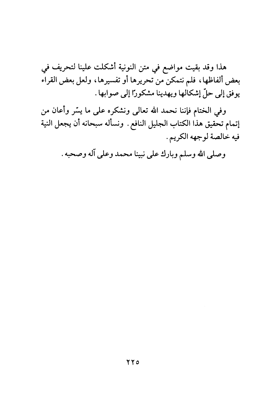 هذا وقد بقيت مواضع في متن النونية أشكلت علينا لتحريف في بعض ألفاظها، فلم نتمكن من تحريرها أو تفسيرها، ولعل بعض القراء يوفق إلى حلّ إشكالها ويهدينا مشكورًا إلى صوابها.