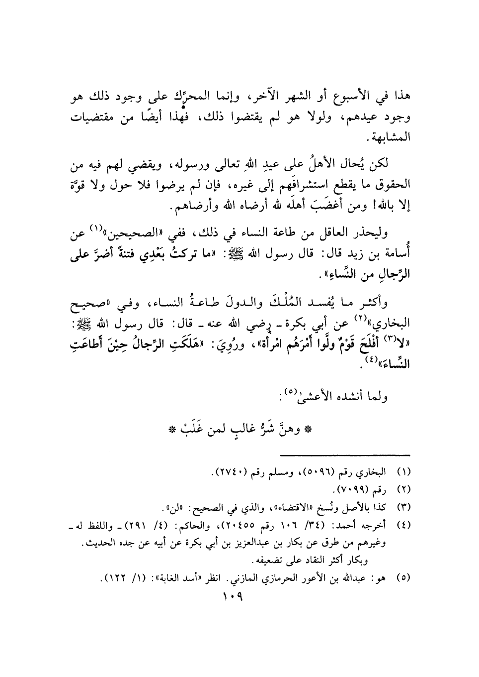 وليحذر العاقل من طاعة النساء في ذلك، ففي "الصحيحين" (¬١) عن أُسامة بن زيد قال: قال رسول الله -صلى الله عليه وسلم-: "ما تركتُ بَعْدِي فتنةً أضرَّ على الرِّجالِ من النِّساءِ".