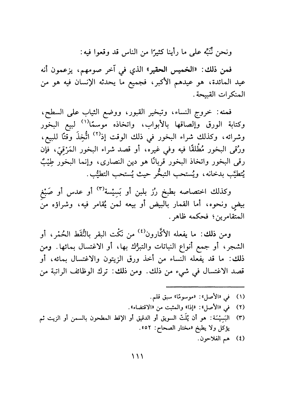 فمنه: خروج النساء، وتبخير القبور، ووضع الثياب على السطح، وكتابة الورق وإلصاقها بالأبواب، واتخاذه موسمًا (¬١) لبيع البخور وشرائه، وكذلك شراء البخور في ذلك الوقت إذ (¬٢) اتُّخِذَ وقتًا للبيع، ورُقي البخور مُطْلقًا فيه وفي غيره، أو قصد شراء البخور المَرْقِيّ، فإن رقي البخور واتخاذ البخور قربانًا هو دين النصارى، وإنما البخور طِيْبٌ يُتطيَّب بدخانه، ويُستحب التبحُّر حيث يُستحب التطيُّب.