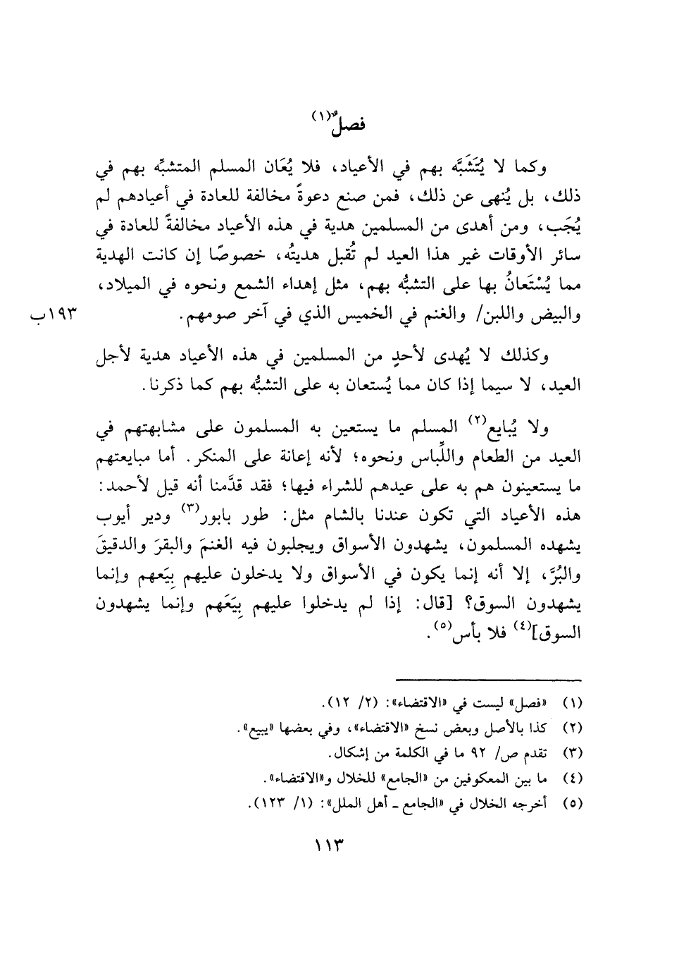 ولا يُبايع (¬٢) المسلم ما يستعين به المسلمون على مشابهتهم في العيد من الطعام واللِّباس ونحوه؛ لأنه إعانة على المنكر. أما مبايعتهم ما يستعينون هم به على عيدهم للشراء فيها؛ فقد قدَّمنا أنه قيل لأحمد: هذه الأعياد التي تكون عندنا بالشام مثل: طور بابور (¬٣) ودير أيوب يشهده المسلمون، يشهدون الأسواق ويجلبون فيه الغنمَ والبقرَ والدقيقَ والبُرَّ، إلا أنه إنما يكون في الأسواق ولا يدخلون عليهم بِيَعهم وإنما يشهدون السوق؟ [قال: إذا لم يدخلوا عليهم بِيَعَهم وإنما يشهدون السوق] (¬٤) فلا بأس (¬٥).