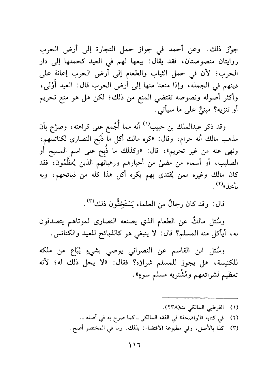 وقد ذكر عبد الملك بن حبيب (¬١) أنه مما أُجْمع على كراهته، وصرَّح بأن مذهب مالك أنه حرام، وقال: "کره مالك أكل ما ذَبَح النصارى لكنائسهم، ونهي عنه من غير تحريم"، قال: "وكذلك ما ذُبِح على اسم المسيح أو الصليب، أو أسماء من مضى من أحبارهم ورهبانهم الذين يُعظَّمُون، فقد كان مالك وغيره ممن يُقتدي بهم يكره أكل هذا كله من ذبائحهم، وبه نأخذ" (¬٢) .