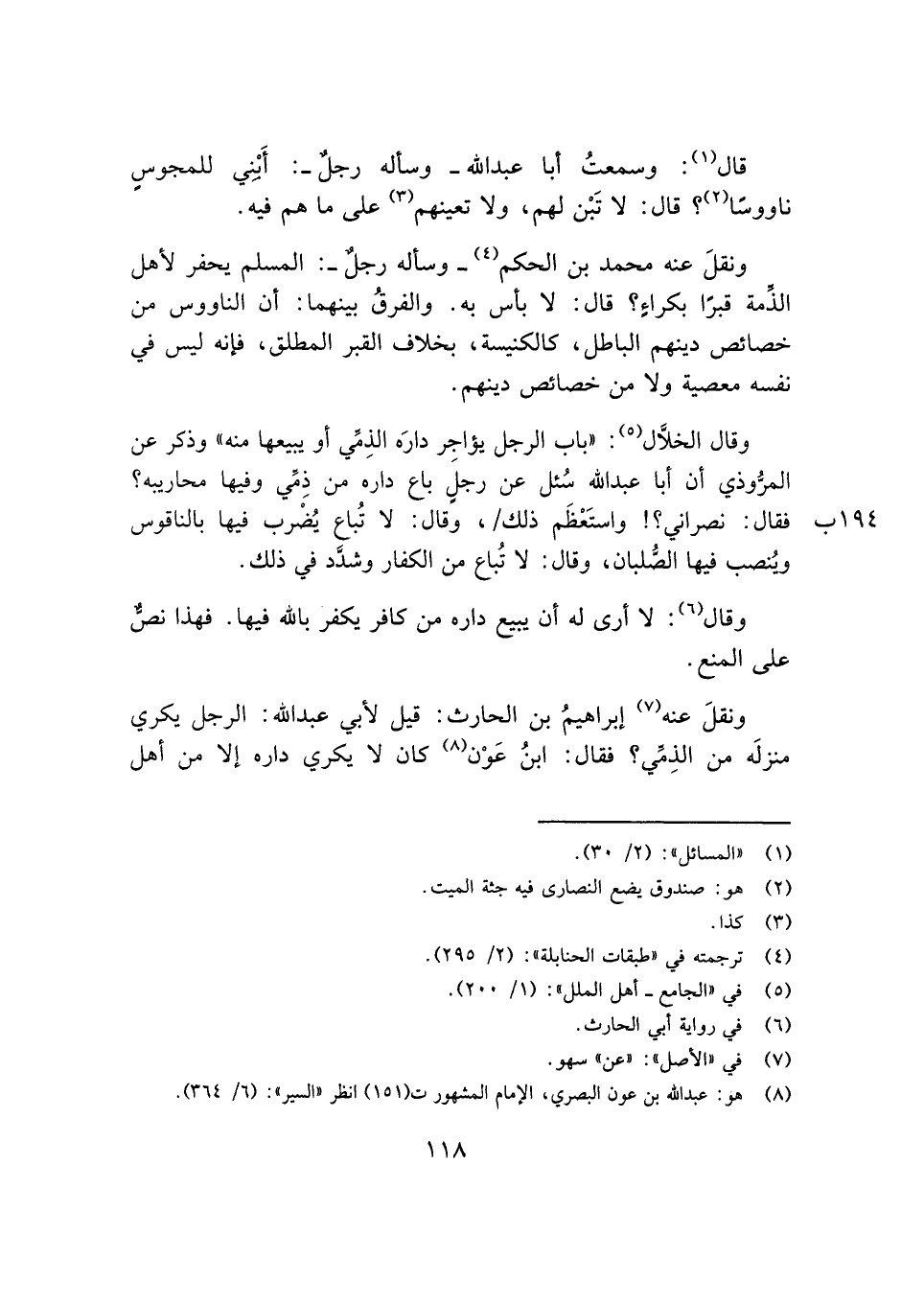 قال (¬١) : وسمعتُ أبا عبد الله -وسأله رجلٌ-: أَبْنِي للمجوسٍ ناووسًا (¬٢) ؟ قال: لا تَبْن لهم، ولا تعينهم (¬٣) على ما هم فيه.