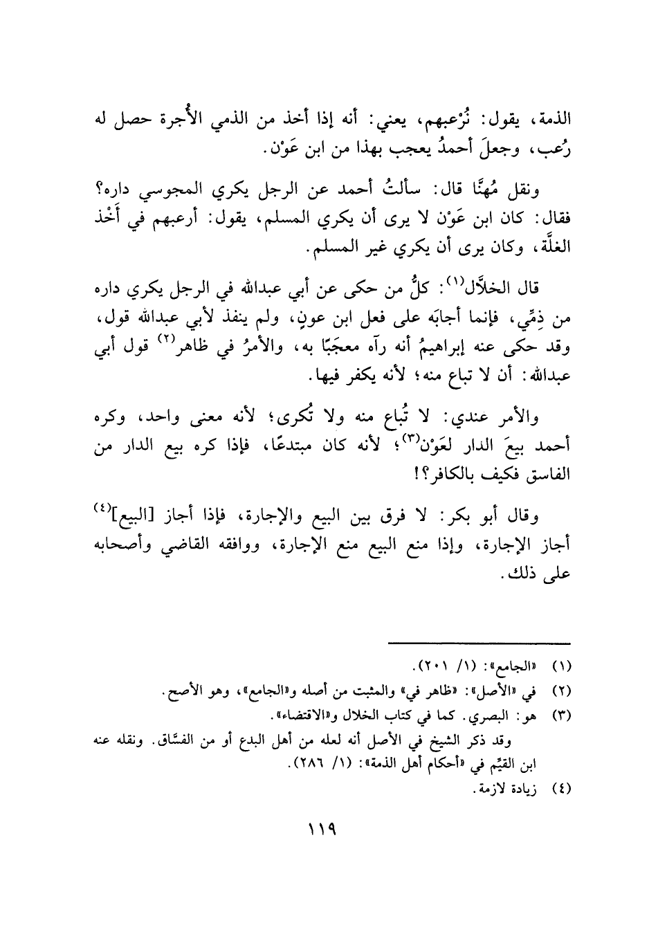 ونقل مُهنَّا قال: سألتُ أحمد عن الرجل يكري المجوسي داره؟ فقال: كان ابن عَوْن لا يرى أن يكري المسلم، يقول: أرعبهم في أَخْذ الغلَّة، وكان يرى أن يكري غير المسلم.
