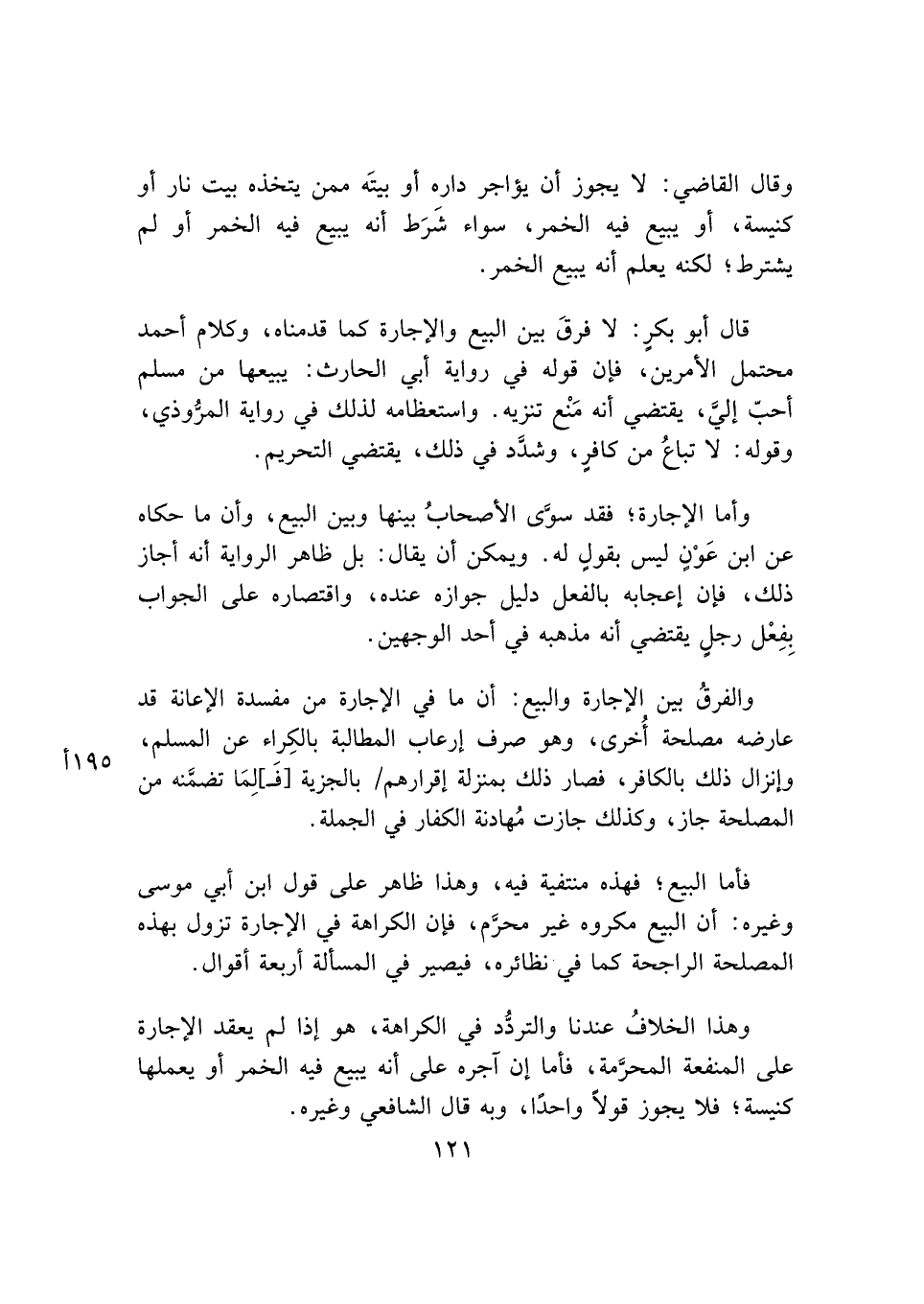 وقال القاضي: لا يجوز أن يؤاجر داره أو بيتَه ممن يتخذه بيت نار أو کنيسة، أو يبيع فيه الخمر، سواء شَرَط أنه يبيع فيه الخمر أو لم يشترط؛ لكنه يعلم أنه يبيع الخمر.