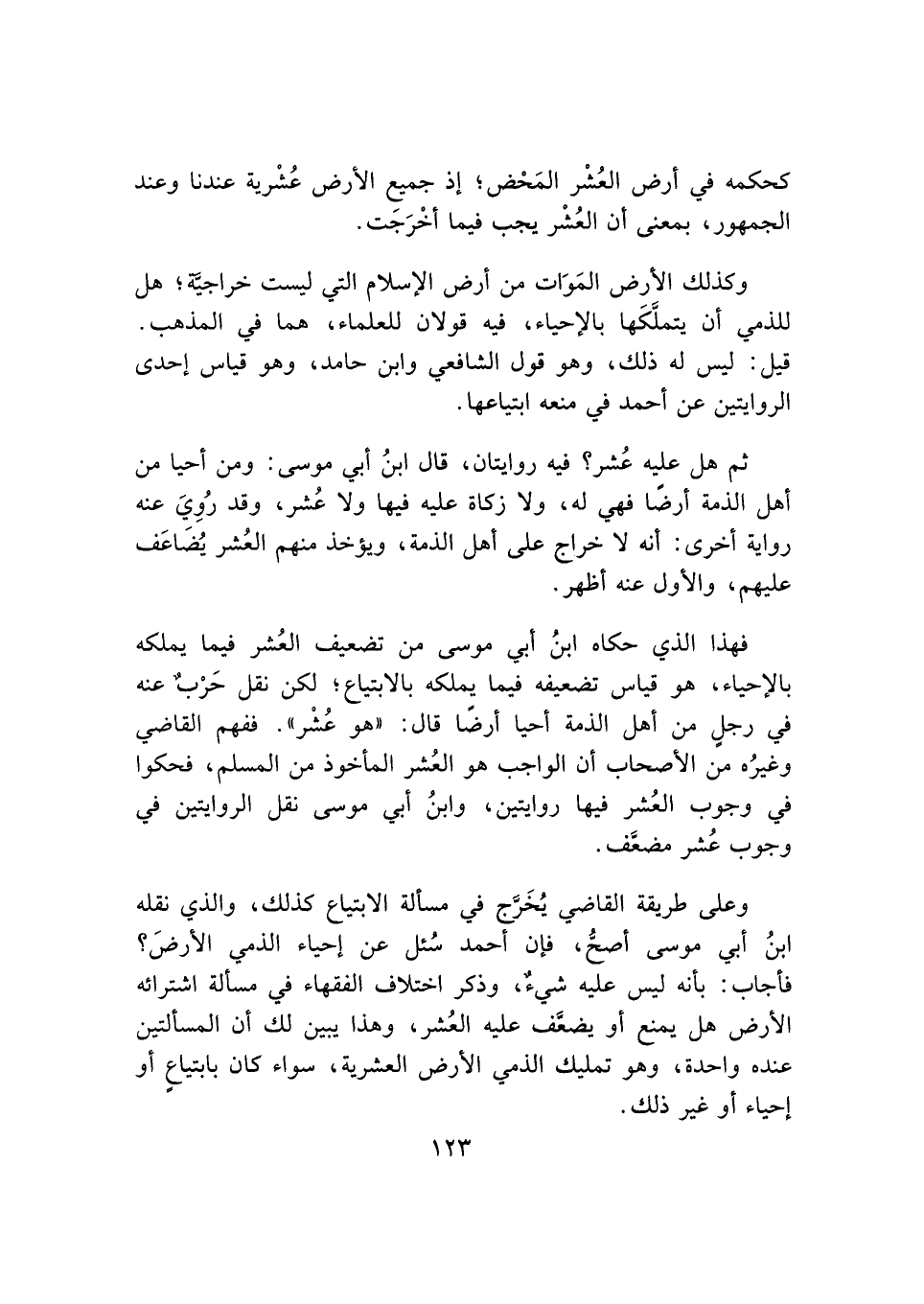 فهذا الذي حكاه ابنُ أبي موسى من تضعيف العُشر فيما يملكه بالإحياء، هو قياس تضعيفه فيما يملكه بالابتياع؛ لكن نقل حَرْبٌ عنه في رجلٍ من أهل الذمة أحيا أرضًا قال: "هو عُشْر". ففهم القاضي وغيرُه من الأصحاب أن الواجب هو العُشر المأخوذ من المسلم، فحكوا في وجوب العُشر فيها روايتين، وابنُ أبي موسى نقل الروايتين في وجوب عُشر مضعَّف.
