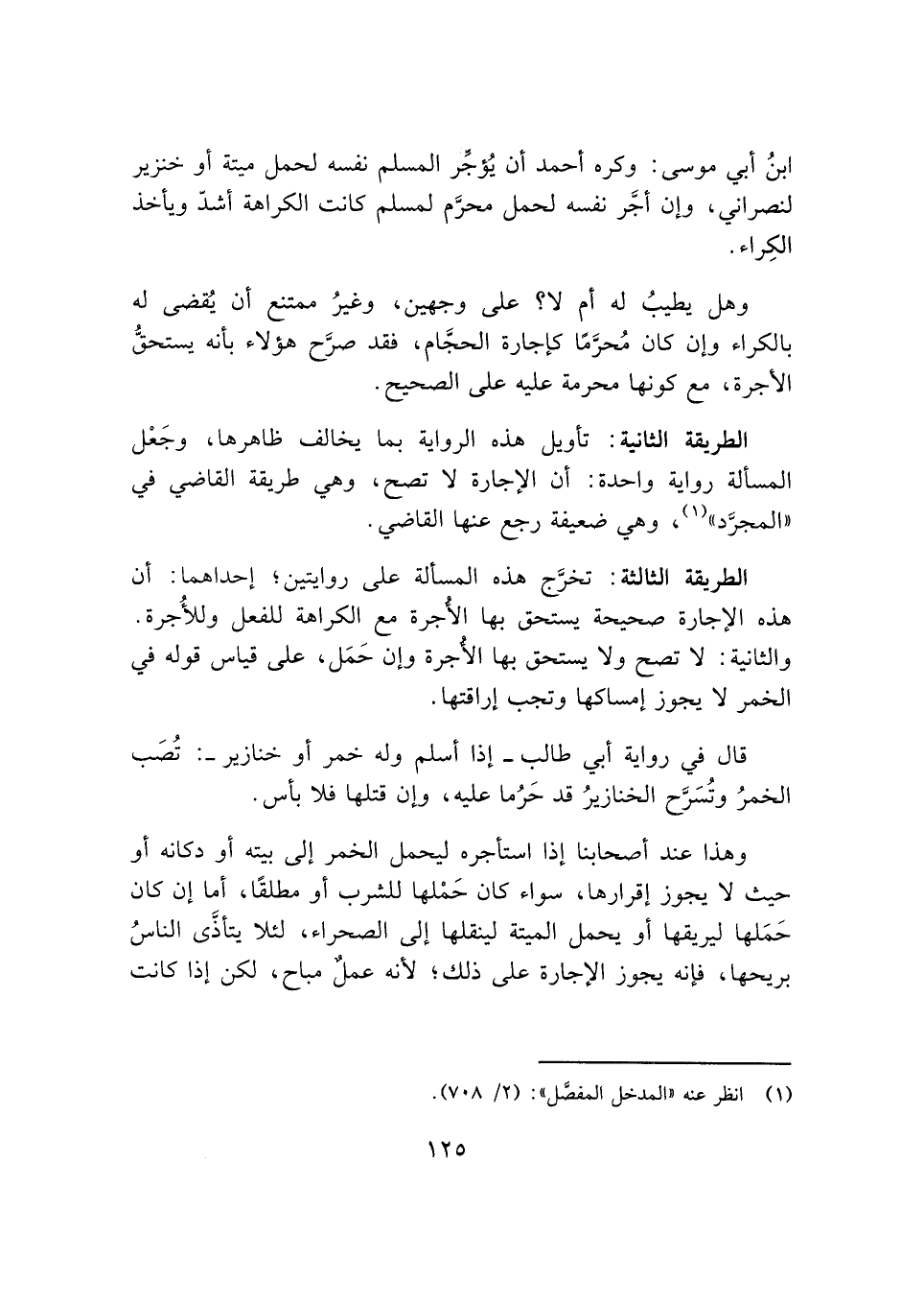 الطريقة الثالثة: تخرج هذه المسألة على روايتين؛ إحداهما: أن هذه الإجارة صحيحة يستحق بها الأُجرة مع الكراهة للفعل وللأُجرة. والثانية: لا تصح ولا يستحق بها الأُجرة وإن حَمَل، على قياس قوله في الخمر لا يجوز إمساكها وتجب إراقتها.