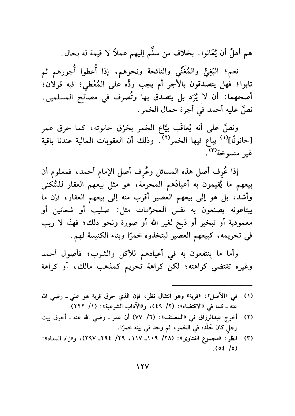 إذا عُرف أصل هذه المسائل وعُرِف أصل الإمام أحمد، فمعلوم أن بيعهم ما يُقيمون به أعيادَهم المحرمة، هو مثل بيعهم العقار للسُّكنى وأشد، بل هو إلى بيعهم العصير أقرب منه إلى بيعهم العقار، فإن ما يبتاعونه يصنعون به نفس المحرَّمات مثل: صليب أو شعانين أو معمودية أو تبخير أو ذبح لغير الله أو صورة ونحو ذلك؛ فهذا لا ريب في تحريمه، كبيعهم العصير ليتخذوه خمرًا وبناء الكنيسة لهم.