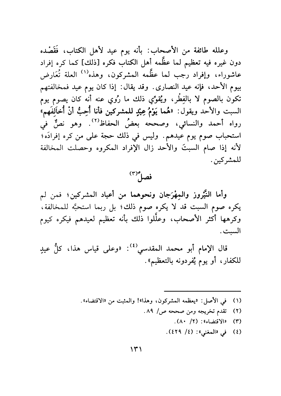 وعلله طائفة من الأصحاب: بأنه يوم عيد لأهل الكتاب، فَقَصْده دون غيره فيه تعظيم لما عظَّمه أهل الكتاب فكره [ذلك] كما کره إفراد عاشوراء، وإفراد رجب لما عظَّمه المشركون، وهذه (¬١) العلة تُعَارض بيوم الأحد، فإنه عيد النصارى. وقد يقال: إذا كان يوم عيد فمخالفتهم تكون بالصوم لا بالفِطْر، ويُقوِّي ذلك ما رُوي عنه أنه كان يصوم يوم السبت والأحد ويقول: "هُما يَوْمُ عِيْدٍ للمشركين فأنا أُحِبُّ أنْ أُخَالِفَهم" رواه أحمد والنسائي، وصححه بعضُ الحفاظ (¬٢). وهو نصٌّ في استحباب صوم يوم عيدهم. وليس في ذلك حجة على من کره إفرادَه؛ لأنه إذا صام السبتَ والأحد زال الإفراد المكروه وحصلت المخالفة للمشرکين.