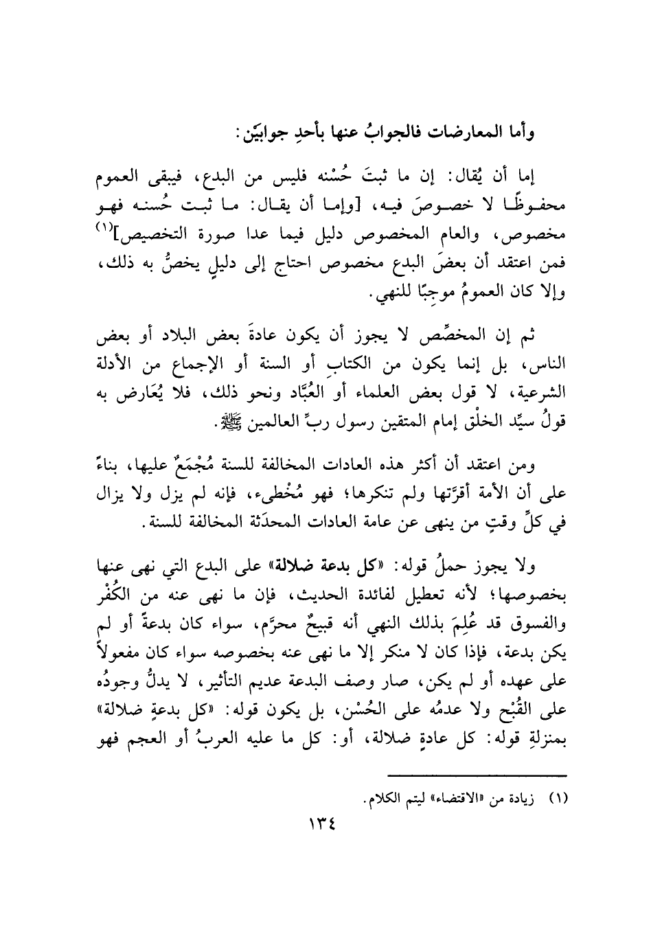 ومن اعتقد أن أكثر هذه العادات المخالفة للسنة مُجْمَعٌ عليها، بناءً على أن الأمة أقرَّتها ولم تنكرها؛ فهو مُخطئ، فإنه لم يزل ولا يزال في كلِّ وقتٍ من ينهى عن عامة العادات المحدَثة المخالفة للسنة.