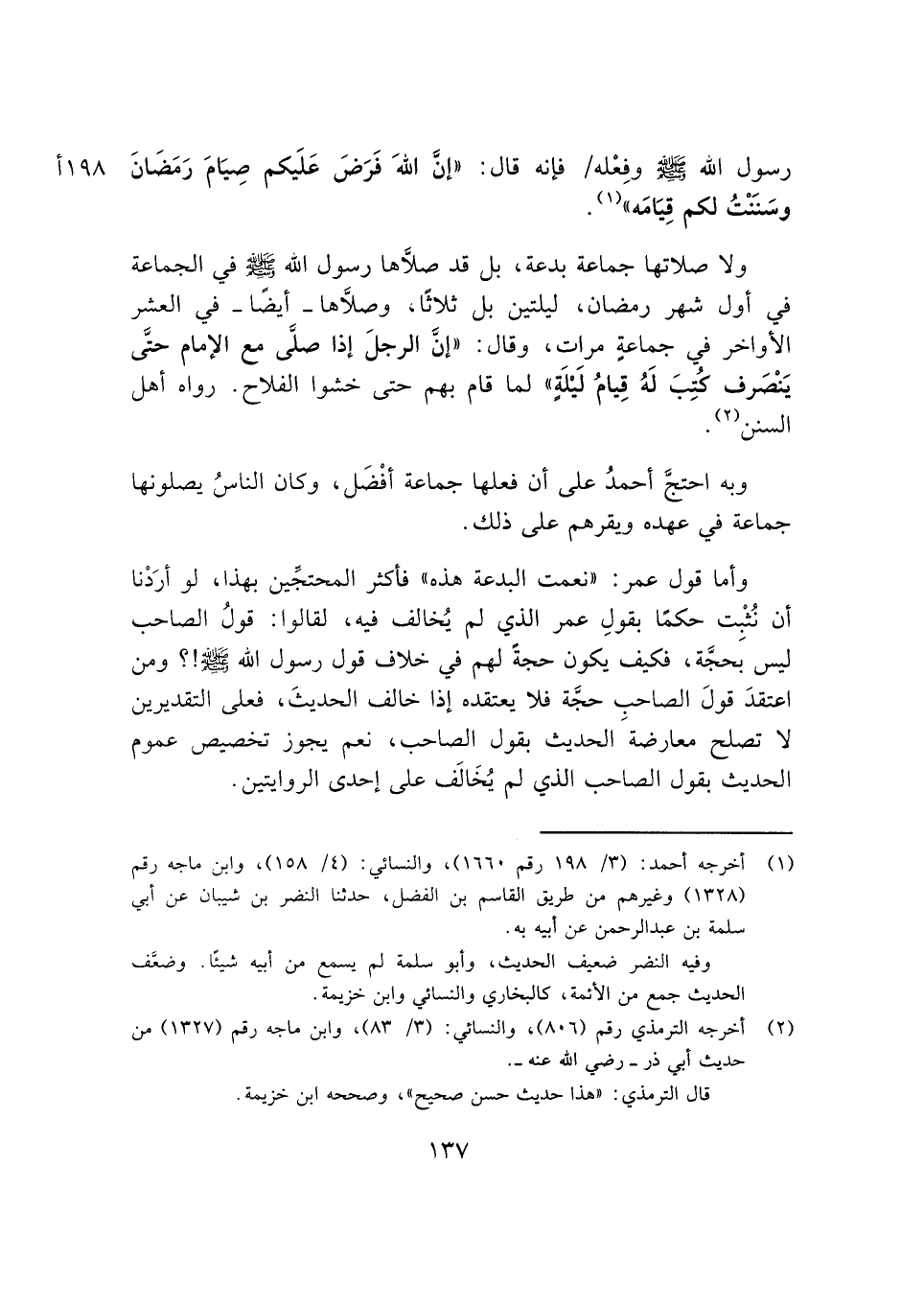 وأما قول عمر: "نعمت البدعة هذه" فأكثر المحتجِّين بهذا، لو أرَدْنا أن نُثْبِت حكمًا بقول عمر الذي لم يُخالف فيه، لقالوا: قولُ الصاحب ليس بحجَّة، فكيف يكون حجةً لهم في خلاف قول رسول الله -صلى الله عليه وسلم-!؟ ومن اعتقدَ قولَ الصاحبِ حجَّة فلا يعتقده إذا خالف الحديثَ، فعلى التقديرين لا تصلح معارضة الحديث بقول الصاحب، نعم يجوز تخصيص عموم الحديث بقول الصاحب الذي لم يُخَالَف على إحدى الروايتين.
