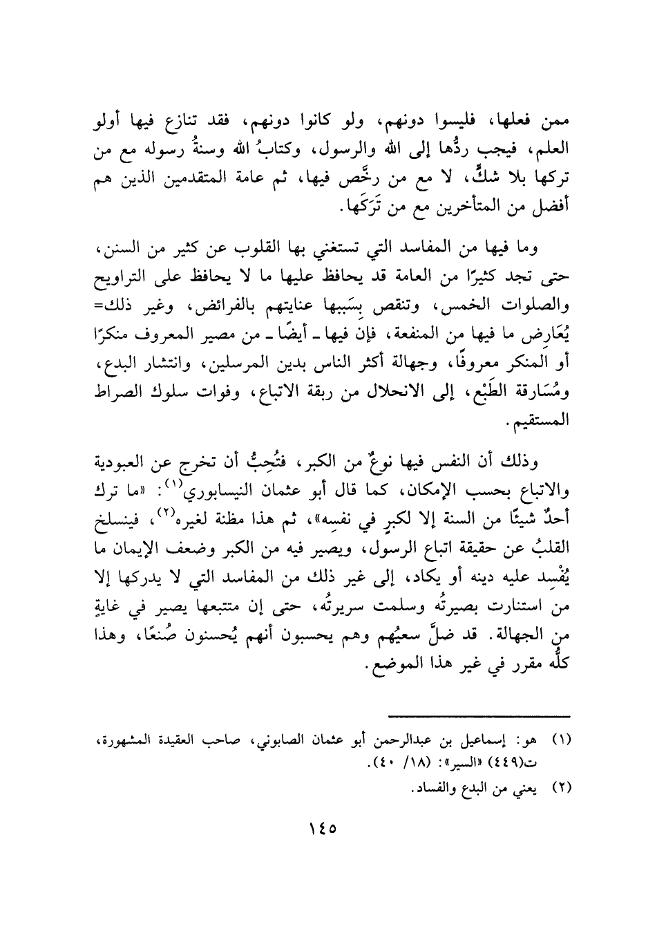 وذلك أن النفس فيها نوعٌ من الكبر، فتُحِبُّ أن تخرج عن العبودية والاتباع بحسب الإمكان، كما قال أبو عثمان النيسابوري (¬١) : "ما ترك أحدٌ شيئًا من السنة إلا لكبرٍ في نفسِه"، ثم هذا مظنة لغيره (¬٢) ، فينسلخ القلبُ عن حقيقة اتباع الرسول، ويصير فيه من الكبر وضعف الإيمان ما يُفْسِد عليه دينه أو يكاد، إلى غير ذلك من المفاسد التي لا يدركها إلا من استنارت بصيرتُه وسلمت سريرتُه، حتى إن متتبعها يصير في غايةٍ من الجهالة. قد ضلَّ سعيُهم وهم يحسبون أنهم يُحسنون صُنعًا، وهذا كلُّه مقرر في غير هذا الموضع.
