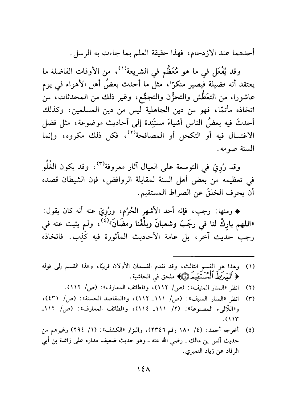 (¬٣) انظر "المنار المنيف": (ص/ ١١١ - ١١٢)، و "المقاصد الحسنة": (ص/ ٤٣١)، و"اللآلي المصنوعة": (٢/ ١١١ - ١١٤)، و"لطائف المعارف": (ص/ ١١٢ - ١١٣).