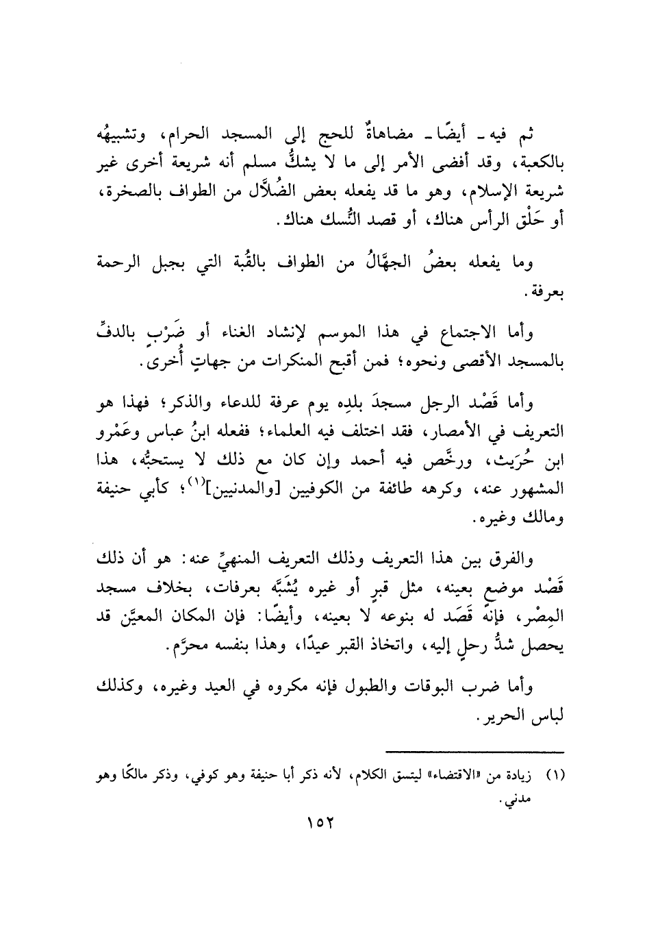 والفرق بين هذا التعريف وذلك التعريف المنهيِّ عنه: هو أن ذلك قَصْد موضعٍ بعينه، مثل قبرٍ أو غيره يُشَبَّه بعرفات، بخلاف مسجد المِصْر، فإنه قَصَد له بنوعه لا بعينه، وأيضًا: فإن المكان المعيَّن قد يحصل شدُّ رحلٍ إليه، واتخاذ القبر عيدًا، وهذا بنفسه محرَّم.