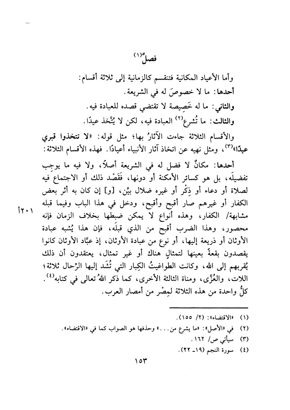 أحدها: مكانٌ لا فضل له في الشريعة أصلًا، ولا فيه ما يوجِب تفضيلَه، بل هو كسائر الأمكنة أو دونها، فَقَصْد ذلك أو الاجتماع فيه لصلاة أو دعاء أو ذِكْر أو غيره ضلال بيِّن، [و] إن كان به أثر بعض الكفار أو غيرهم صار أقبح وأقبح، ودخل في هذا الباب وفيما قبله مشابهة الكفار، وهذه أنواع لا يمكن ضبطها بخلاف الزمان فإنه محصور، وهذا الضرب أقبح من الذي قبلَه، فإن هذا يُشبه عبادة الأوثان أو ذريعة إليها، أو نوع من عبادة الأوثان، إذ عبَّاد الأوثان كانوا يقصدون بقعةً بعينها لتمثالٍ هناك أو غير تمثال، يعتقدون أن ذلك يُقربهم إلى الله، وكانت الطواغيتُ الكِبار التي تُشَد إليها الرِّحال ثلاثة؛ اللات، والعُزَّى، ومناة الثالثة الأخرى، كما ذكر اللهُ تعالى في كتابه (¬٤). كلُّ واحدة من هذه الثلاثة لمِصْر من أمصار العرب.