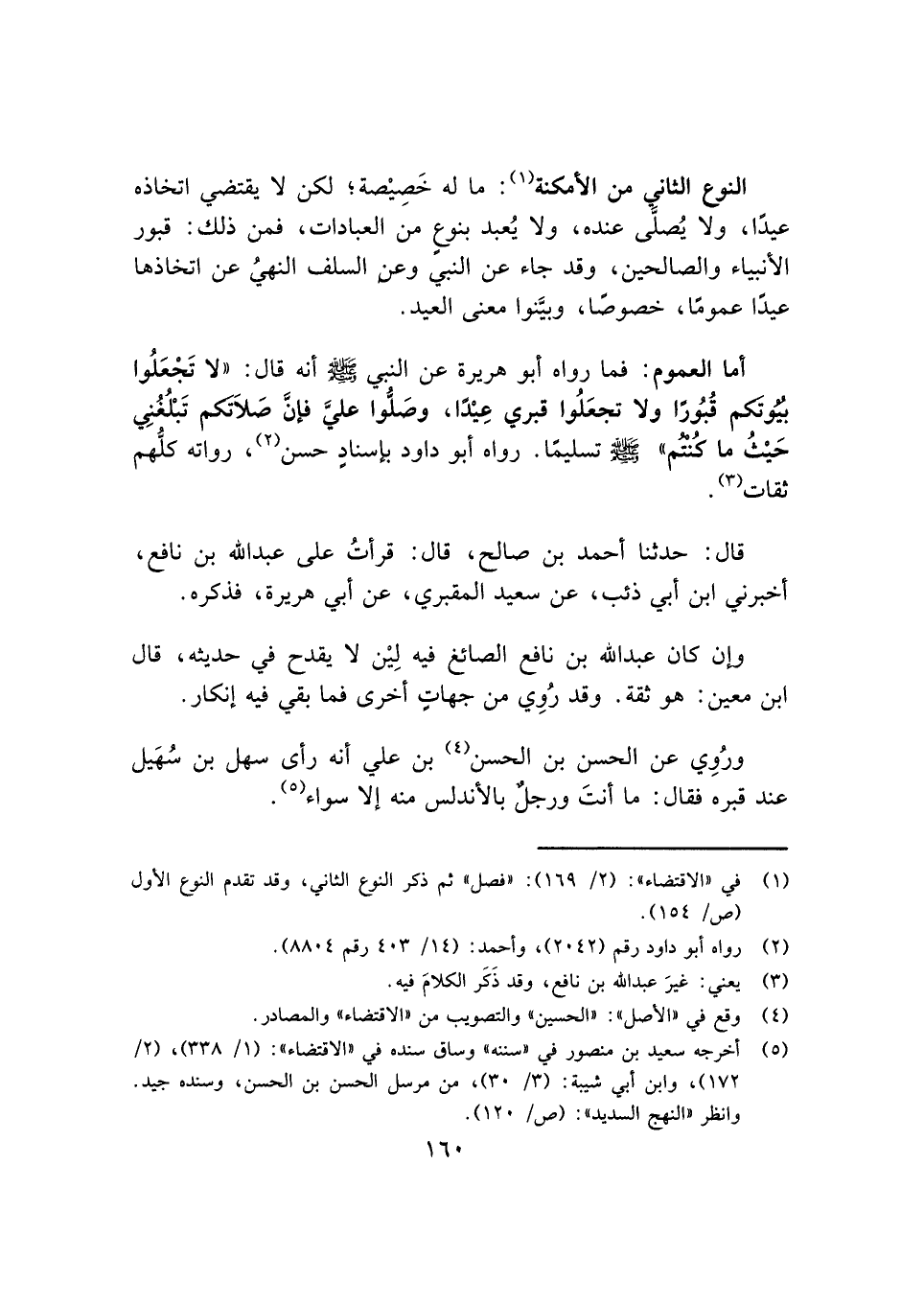النوع الثاني من الأمكنة (¬١): ما له خَصِيْصة؛ لكن لا يقتضي اتخاذه عيدًا، ولا يُصلَّي عنده، ولا يُعبد بنوعٍ من العبادات، فمن ذلك: قبور الأنبياء والصالحين، وقد جاء عن النبي وعن السلف النهيُ عن اتخاذها عيدًا عمومًا، خصوصًا، وبيَّنوا معنى العيد.