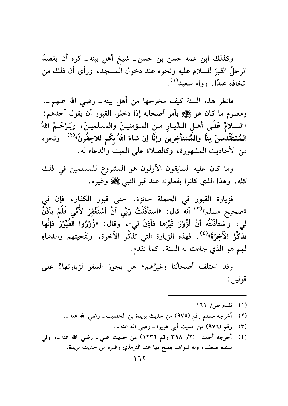 فانظر هذه السنة كيف مخرجها من أهل بيته -رضي الله عنهم-. ومعلوم ما كان هو -صلى الله عليه وسلم- يأمر أصحابه إذا دخلوا القبور أن يقول أحدهم: "السلامُ عَلَى أهل الدِّيارِ من المؤمنينَ والمسلمينَ، ويَرْحَمُ اللهُ المُسْتَقْدمينَ مِنَّا والمُسْتأخِرين وإنَّا إن شاءَ اللهُ بِكُم للاحِقُونَ" (¬٢) . ونحوه من الأحاديث المشهورة، وكالصلاة على الميت والدعاء له.