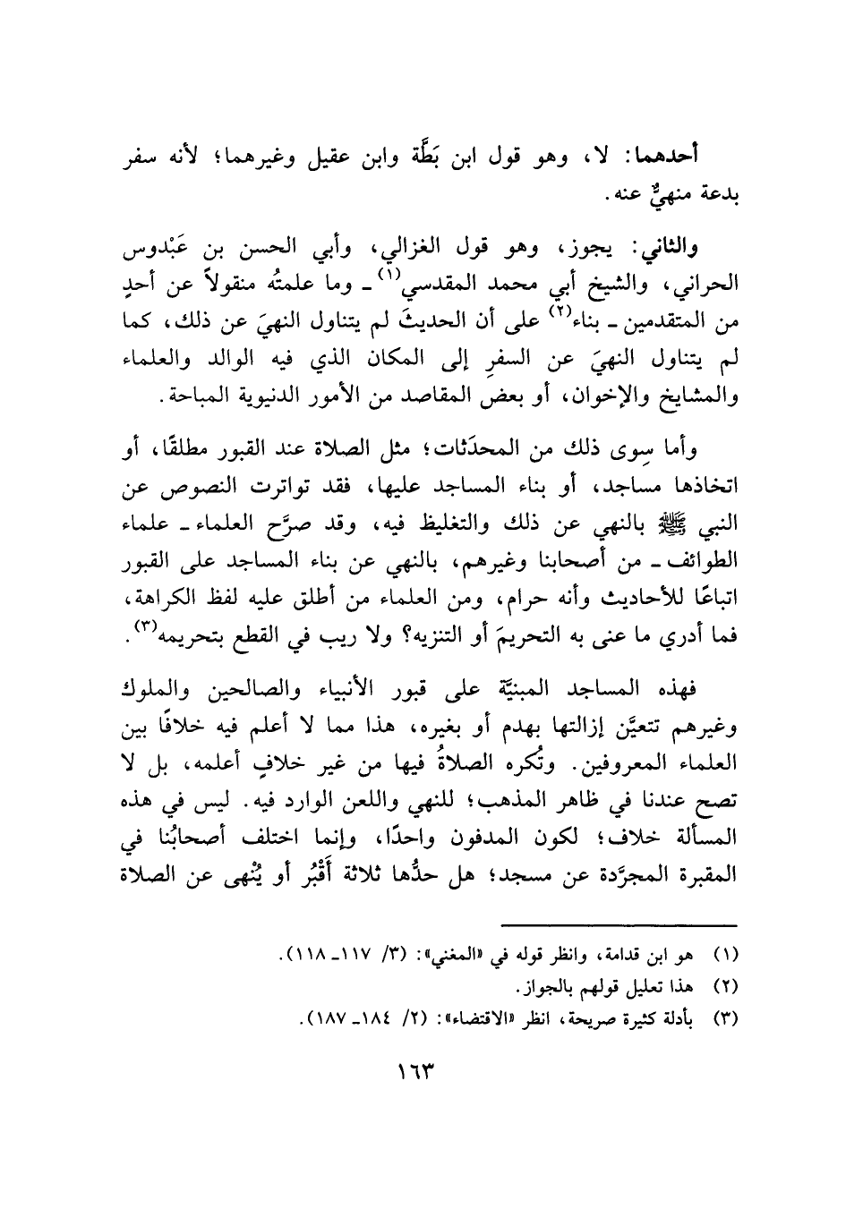 وأما سِوى ذلك من المحدَثات؛ مثل الصلاة عند القبور مطلقًا، أو اتخاذها مساجد، أو بناء المساجد عليها، فقد تواترت النصوص عن النبي -صلى الله عليه وسلم- بالنهي عن ذلك والتغليظ فيه، وقد صرَّح العلماء -علماء الطوائف- من أصحابنا وغيرهم، بالنهي عن بناء المساجد على القبور اتباعًا للأحاديث وأنه حرام، ومن العلماء من أطلق عليه لفظ الكراهة، فما أدري ما عنى به التحريمَ أو التنزيه؟ ولا ريب في القطع بتحريمه (¬٣) .