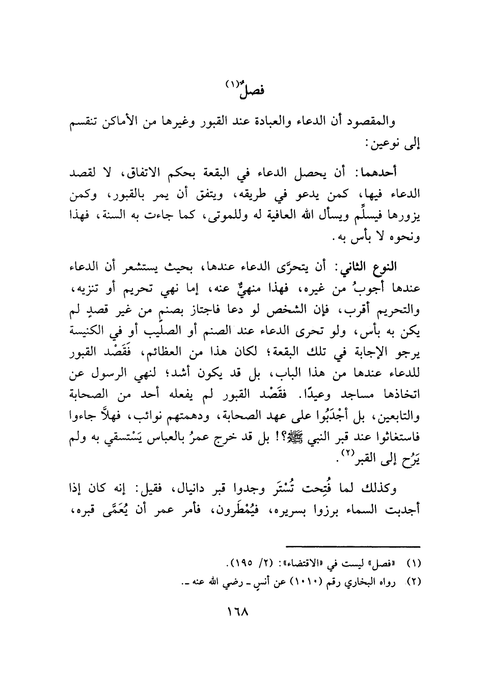 النوع الثاني: أن يتحرَّى الدعاء عندها، بحيث يستشعر أن الدعاء عندها أجوبُ من غيره، فهذا منهيٌّ عنه، إما نهي تحريم أو تنزيه، والتحريم أقرب، فإن الشخص لو دعا فاجتاز بصنمٍ من غير قصدٍ لم يكن به بأس، ولو تحرى الدعاء عند الصنم أو الصليب أو في الكنيسة يرجو الإجابة في تلك البقعة؛ لكان هذا من العظائم، فَقَصْد القبور للدعاء عندها من هذا الباب، بل قد يكون أشد؛ لنهي الرسول عن اتخاذها مساجد وعيدًا. فقَصْد القبور لم يفعله أحد من الصحابة والتابعين، بل أجْدَبُوا على عهد الصحابة، ودهمتهم نوائب، فهلَّا جاءوا فاستغاثوا عند قبر النبي -صلى الله عليه وسلم-؟! بل قد خرج عمرُ بالعباس يَسْتسقي به ولم يَرُح إلى القبر (¬٢).
