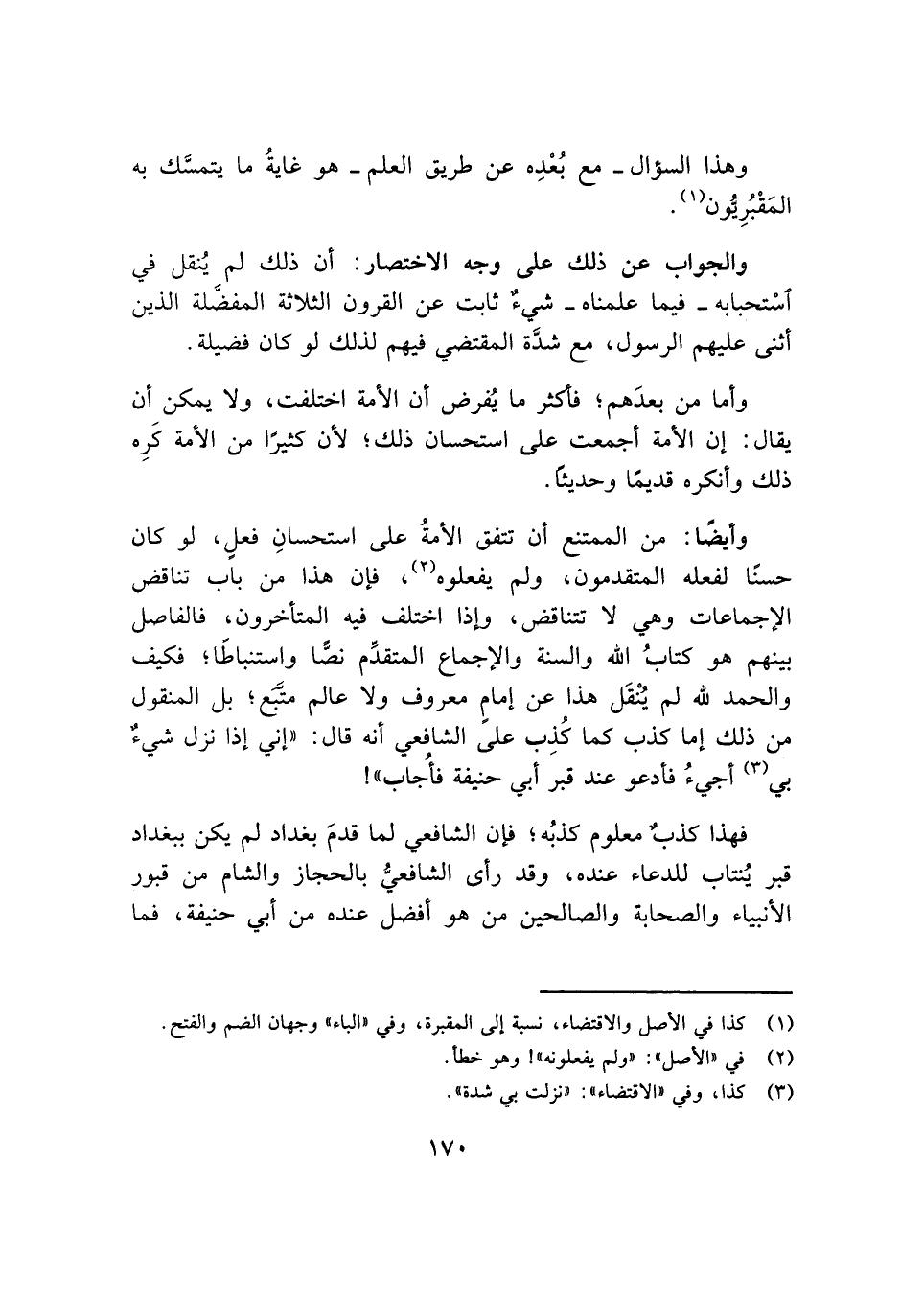 وأيضًا: من الممتنع أن تتفق الأمةُ على استحسانِ فعلٍ، لو كان حسنًا لفعله المتقدمون، ولم يفعلوه (¬٢)، فإن هذا من باب تناقض الإجماعات وهي لا تتناقض، وإذا اختلف فيه المتأخرون، فالفاصل بينهم هو كتابُ الله والسنة والإجماع المتقدِّم نصًّا واستنباطًا؛ فكيف والحمد لله لم يُنْقَل هذا عن إمامٍ معروف ولا عالم متَّبَع؛ بل المنقول من ذلك إما كذب كما كُذِب على الشافعي أنه قال: "إني إذا نزل شيءٌ بي (¬٣) أجيءُ فأدعو عند قبر أبي حنيفة فأُجاب"!