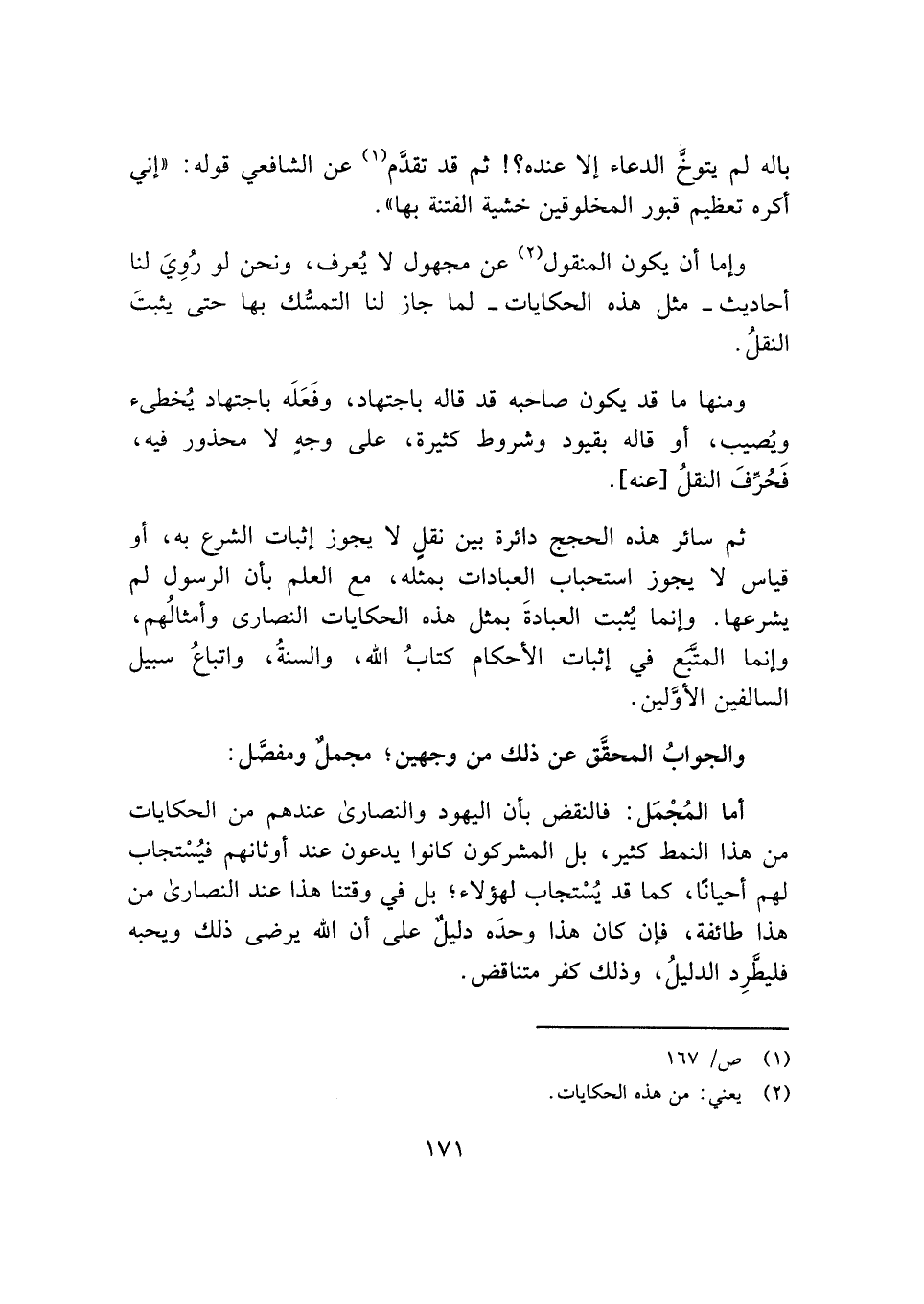 ثم سائر هذه الحجج دائرة بين نقلٍ لا يجوز إثبات الشرع به، أو قياس لا يجوز استحباب العبادات بمثله، مع العلم بأن الرسول لم يشرعها. وإنما يُثبت العبادةَ بمثل هذه الحكايات النصارى وأمثالُهم، وإنما المتَّبَع في إثبات الأحكام كتابُ الله، والسنةُ، واتباعُ سبيل السالفين الأوَّلين.