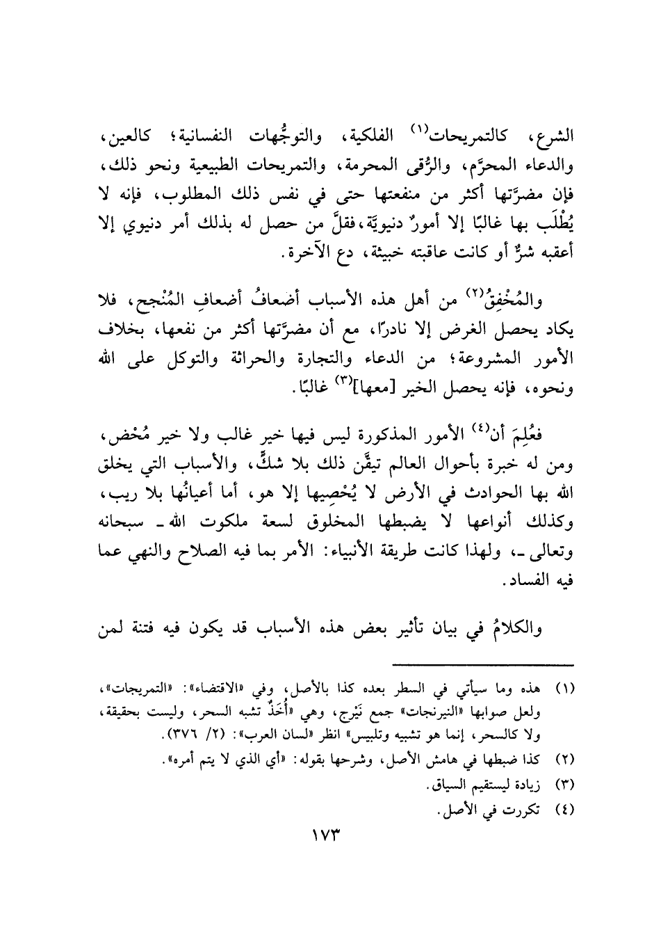 الشرع، كالتمريحات (¬١) الفلكية، والتوجُّهات النفسانية؛ كالعين، والدعاء المحرَّم، والرُّقى المحرمة، والتمريحات الطبيعية ونحو ذلك، فإن مضرَّتها أكثر من منفعتها حتى في نفس ذلك المطلوب، فإنه لا يُطْلَب بها غالبًا إلا أمورٌ دنيويَّة، فقلَّ من حصل له بذلك أمر دنيوي إلا أعقبه شرٌّ أو كانت عاقبته خبيثة، دع الآخرة.