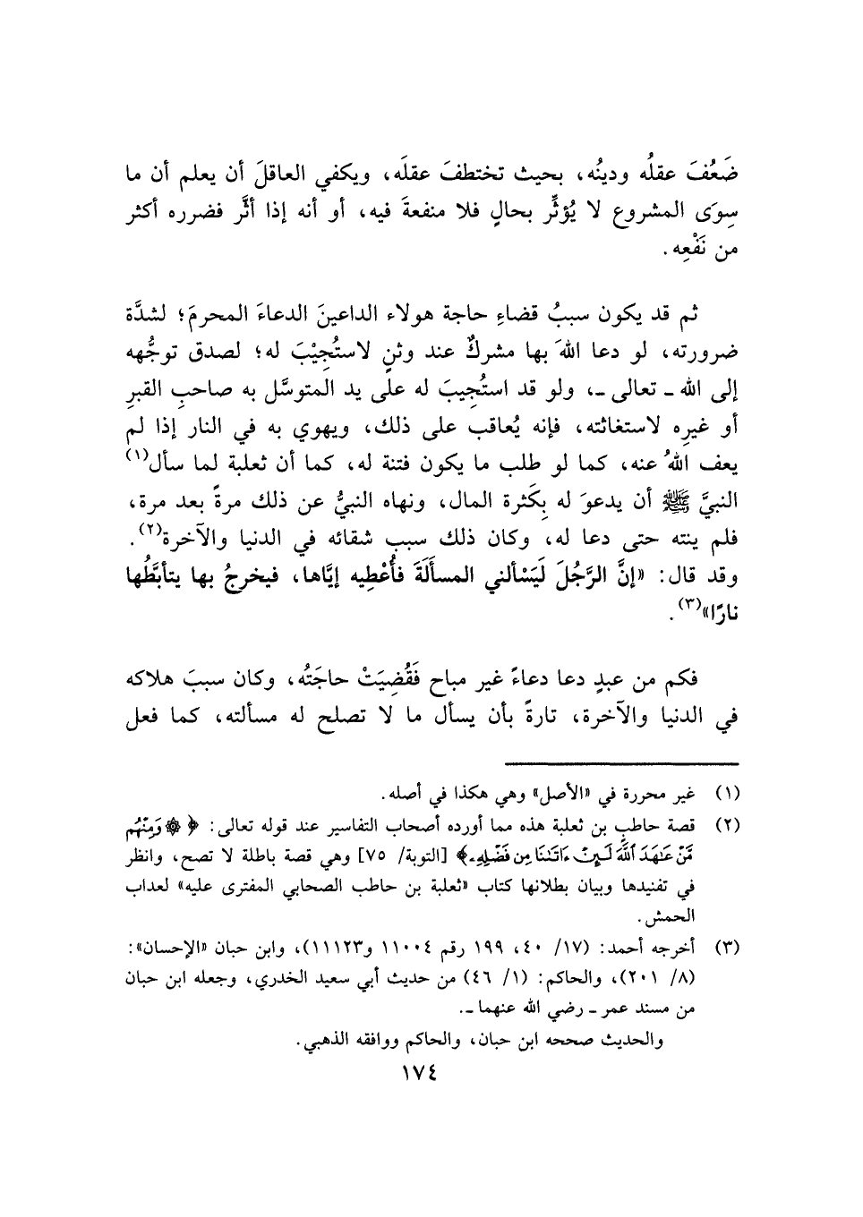 ثم قد يكون سببُ قضاءِ حاجة هولاء الداعينَ الدعاءَ المحرمَ؛ لشدَّة ضرورته، لو دعا اللهَ بها مشركٌ عند وثنٍ لاستُجِيْبَ له؛ لصدق توجُّهه إلى الله -تعالى-، ولو قد استُجِيبَ له على يد المتوسَّل به صاحبِ القبرِ أو غيرِه لاستغاثته، فإنه يُعاقب على ذلك، ويهوي به في النار إذا لم يعف اللهُ عنه، كما لو طلب ما يكون فتنة له، كما أن ثعلبة لما سأل (¬١) النبيَّ -صلى الله عليه وسلم- أن يدعوَ له بِكثَرة المال، ونهاه النبيُّ عن ذلك مرةً بعد مرة، فلم ينته حتى دعا له، وكان ذلك سبب شقائه في الدنيا والآخرة (¬٢) . وقد قال: "إنَّ الرَّجُلَ لَيَسْألني المسأَلَةَ فأُعْطِيه إيَّاها، فيخرجُ بها يتأبَّطُها نارًا" (¬٣) .