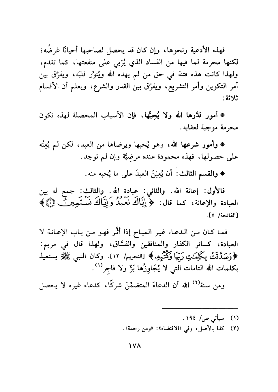 فهذه الأدعية ونحوها، وإن كان قد يحصل لصاحبها أحيانًا غرضُه؛ لكنها محرمة لما فيها من الفساد الذي يُرْبي على منفعتها، كما تقدم، ولهذا كانت هذه فتنة في حق من لم يهده الله ويُنوِّر قلبَه، ويفرِّق بين أمر التكوين وأمر التشريع، ويفرِّق بين القدر والشرع، ويعلم أن الأقسام ثلاثة: